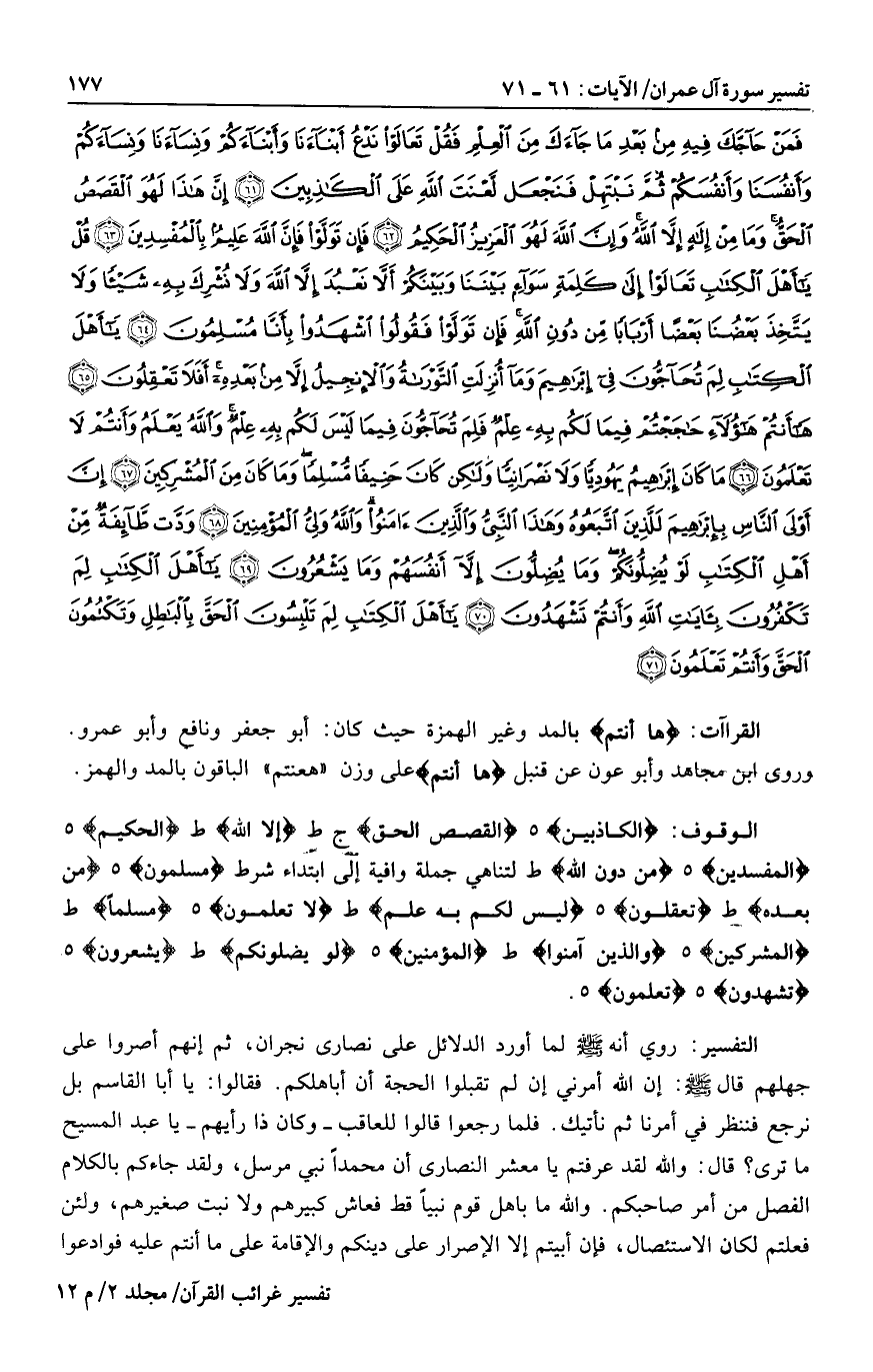 الْكاذِبِينَ هـ الْقَصَصُ الْحَقُّ ج ط إِلَّا اللَّهُ ط الْحَكِيمُ هـ بِالْمُفْسِدِينَ هـ مِنْ دُونِ اللَّهِ ط لتناهي جملة وافية إلى ابتداء شرط مُسْلِمُونَ هـ مِنْ بَعْدِهِ ط تَعْقِلُونَ هـ لَيْسَ لَكُمْ بِهِ عِلْمٌ ط لا تَعْلَمُونَ هـ مُسْلِماً ط الْمُشْرِكِينَ هـ وَالَّذِينَ آمَنُوا ط الْمُؤْمِنِينَ هـ لَوْ يُضِلُّونَكُمْ ط يَشْعُرُونَ هـ تَشْهَدُونَ هـ تَعْلَمُونَ هـ.