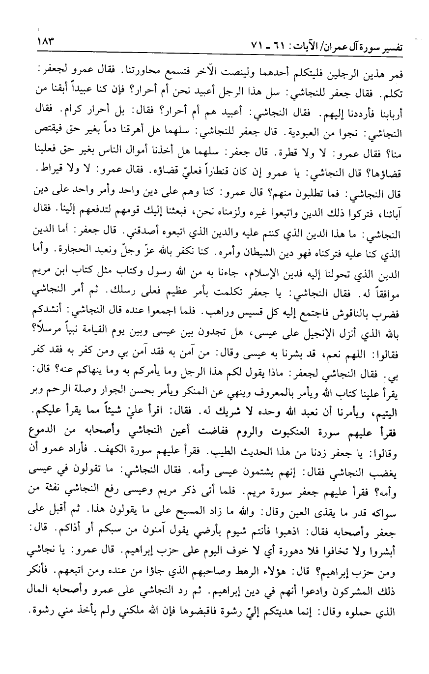 فقرأ عليهم سورة العنكبوت والروم ففاضت أعين النجاشي وأصحابه من الدموع وقالوا: يا جعفر زدنا من هذا الحديث الطيب. فقرأ عليهم سورة الكهف. فأراد عمرو أن يغضب النجاشي فقال: إنهم يشتمون عيسى وأمه. فقال النجاشي: ما تقولون في عيسى وأمه؟ فقرأ عليهم جعفر سورة مريم. فلما أتى ذكر مريم وعيسى رفع النجاشي نفثة من سواكه قدر ما يقذى العين وقال: والله ما زاد المسيح على ما يقولون هذا. ثم أقبل على جعفر وأصحابه فقال: اذهبوا فأنتم شيوم بأرضي يقول آمنون من سبكم أو أذاكم. قال: