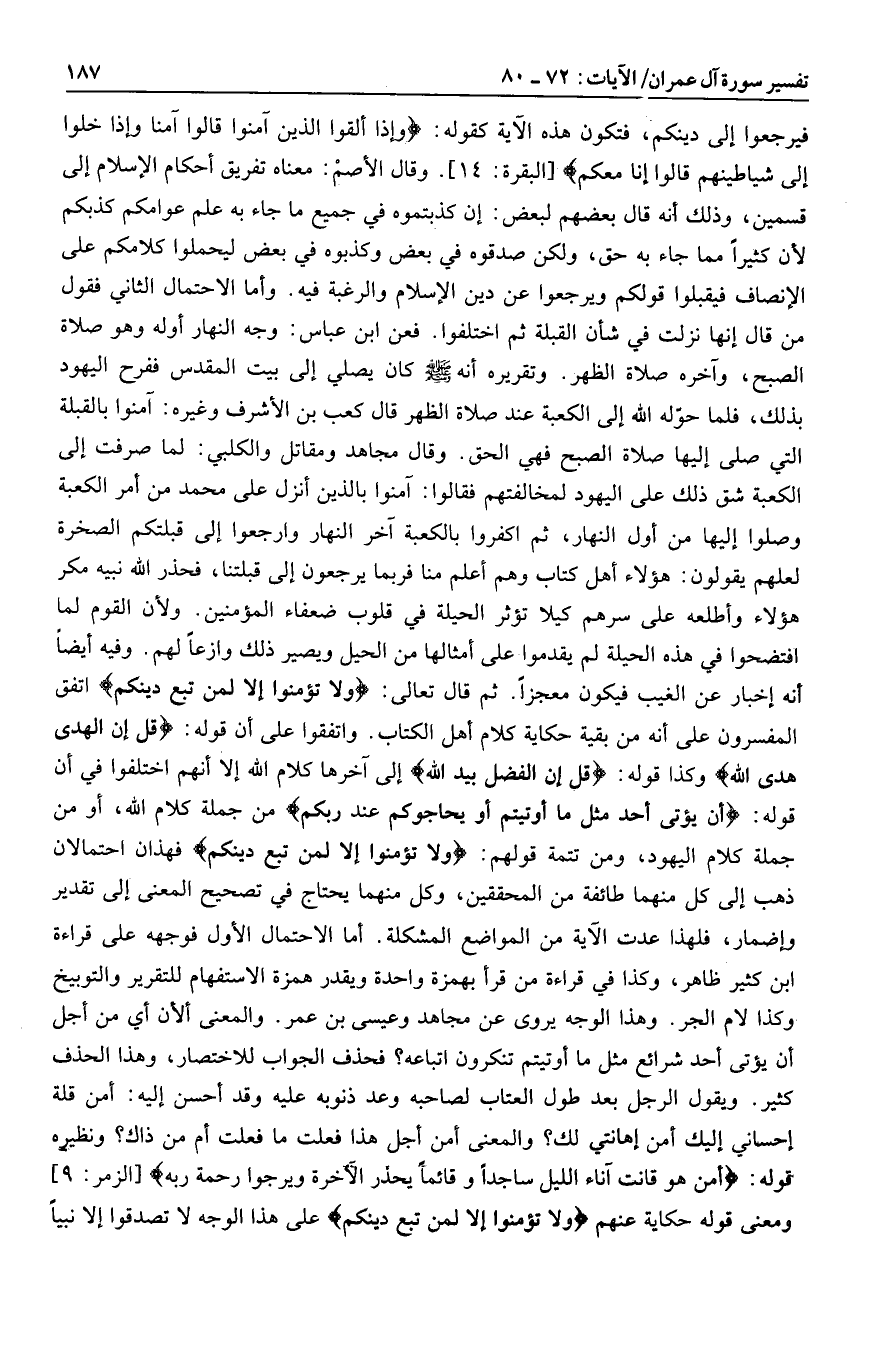 فيرجعوا إلى دينكم، فتكون هذه الآية كقوله: وَإِذا لَقُوا الَّذِينَ آمَنُوا قالُوا آمَنَّا وَإِذا خَلَوْا إِلى شَياطِينِهِمْ قالُوا إِنَّا مَعَكُمْ [البقرة: 14] . وقال الأصم: معناه تفريق أحكام الإسلام إلى قسمين، وذلك أنه قال بعضهم لبعض: إن كذبتموه في جميع ما جاء به علم عوامكم كذبكم لأن كثيرا مما جاء به حق، ولكن صدقوه في بعض وكذبوه في بعض ليحملوا كلامكم على الإنصاف فيقبلوا قولكم ويرجعوا عن دين الإسلام والرغبة فيه. وأما الاحتمال الثاني فقول من قال إنها نزلت في شأن القبلة ثم اختلفوا. فعن ابن عباس: وجه النهار أوله وهو صلاة الصبح، وآخره صلاة الظهر. وتقريره أنه صلى الله عليه وسلم كان يصلي إلى بيت المقدس ففرح اليهود بذلك، فلما حوّله الله إلى الكعبة عند صلاة الظهر قال كعب بن الأشرف وغيره: آمنوا بالقبلة التي صلى إليها صلاة الصبح فهي الحق. وقال مجاهد ومقاتل والكلبي: لما صرفت إلى الكعبة شق ذلك على اليهود لمخالفتهم فقالوا: آمنوا بالذين أنزل على محمد من أمر الكعبة وصلوا إليها من أول النهار، ثم اكفروا بالكعبة آخر النهار وارجعوا إلى قبلتكم الصخرة لعلهم يقولون: هؤلاء أهل كتاب وهم أعلم منا فربما يرجعون إلى قبلتنا، فحذر الله نبيه مكر هؤلاء وأطلعه على سرهم كيلا تؤثر الحيلة في قلوب ضعفاء المؤمنين. ولأن القوم لما افتضحوا في هذه الحيلة لم يقدموا على أمثالها من الحيل ويصير ذلك وازعا لهم. وفيه أيضا أنه إخبار عن الغيب فيكون معجزا. ثم قال تعالى: وَلا تُؤْمِنُوا إِلَّا لِمَنْ تَبِعَ دِينَكُمْ اتفق المفسرون على أنه من بقية حكاية كلام أهل الكتاب. واتفقوا على أن قوله: قُلْ إِنَّ الْهُدى هُدَى اللَّهِ وكذا قوله: قُلْ إِنَّ الْفَضْلَ بِيَدِ اللَّهِ إلى آخرها كلام الله إلا أنهم اختلفوا في أن قوله: أَنْ يُؤْتى أَحَدٌ مِثْلَ ما أُوتِيتُمْ أَوْ يُحاجُّوكُمْ عِنْدَ رَبِّكُمْ من جملة كلام الله، أو من جملة كلام اليهود، ومن تتمة قولهم: وَلا تُؤْمِنُوا إِلَّا لِمَنْ تَبِعَ دِينَكُمْ فهذان احتمالان ذهب إلى كل منهما طائفة من المحققين، وكل منهما يحتاج في تصحيح المعنى إلى تقدير وإضمار، فلهذا عدت الآية من المواضع المشكلة. أما الاحتمال الأول فوجهه على قراءة ابن كثير ظاهر، وكذا في قراءة من قرأ بهمزة واحدة ويقدر همزة الاستفهام للتقرير والتوبيخ وكذا لام الجر. وهذا الوجه يروى عن مجاهد وعيسى بن عمر. والمعنى ألأن أي من أجل أن يؤتى أحد شرائع مثل ما أوتيتم تنكرون اتباعه؟ فحذف الجواب للاختصار، وهذا الحذف كثير. ويقول الرجل بعد طول العتاب لصاحبه وعد ذنوبه عليه وقد أحسن إليه: أمن قلة إحساني إليك أمن إهانتي لك؟ والمعنى أمن أجل هذا فعلت ما فعلت أم من ذاك؟ ونظيره قوله: أَمَّنْ هُوَ قانِتٌ آناءَ اللَّيْلِ ساجِداً وَقائِماً يَحْذَرُ الْآخِرَةَ وَيَرْجُوا رَحْمَةَ رَبِّهِ [الزمر: 9] ومعنى قوله حكاية عنهم وَلا تُؤْمِنُوا إِلَّا لِمَنْ تَبِعَ دِينَكُمْ على هذا الوجه لا تصدقوا إلا نبيا