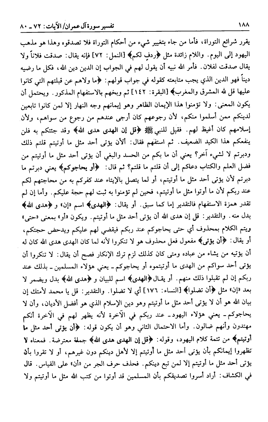 : 142] ثم وبخهم بالاستفهام المذكور. ويحتمل أن يكون المعنى: ولا تؤمنوا هذا الإيمان الظاهر وهو إيمانهم وجه النهار إلا لمن كانوا تابعين لدينكم ممن أسلموا منكم، لأن رجوعهم كان أرجى عندهم من رجوع من سواهم، ولأن إسلامهم كان أغيظ لهم. فقيل للنبي صلى الله عليه وسلم قُلْ إِنَّ الْهُدى هُدَى اللَّهِ وقد جئتكم به فلن ينفعكم هذا الكيد الضعيف. ثم استفهم فقال: ألأن يؤتى أحد مثل ما أوتيتم قلتم ذلك ودبرتم لا لشيء آخر؟ يعني أن ما بكم من الحسد والبغي أن يؤتى أحد مثل ما أوتيتم من فضل العلم والكتاب دعاكم إلى أن قلتم ما قلتم؟ ثم قال: أَوْ يُحاجُّوكُمْ يعني دبرتم ما دبرتم لأن يؤتى أحد مثل ما أوتيتم، أو لما يتصل بالإيتاء عند كفركم به من محاجتهم لكم عند ربكم لأن ما أوتوا مثل ما أوتيتم، فحين لم تؤمنوا به ثبت لهم حجة عليكم. وأما إن لم تقدر همزة الاستفهام فالتقدير إما كما سبق. أو يقال: الْهُدى اسم «إن» وهُدَى اللَّهِ بدل منه. والتقدير: قل إن هدى الله أن يؤتى أحد مثل ما أوتيتم. ويكون «أو» بمعنى «حتى» ويتم الكلام بمحذوف أي حتى يحاجوكم عند ربكم فيقضي لهم عليكم ويدحض حجتكم، أو يقال: أَنْ يُؤْتى مفعول فعل محذوف هو لا تنكروا لأنه لما كان الهدى هدى الله كان له أن يؤتيه من يشاء من عباده ومتى كان كذلك لزم ترك الإنكار فصح أن يقال: لا تنكروا أن يؤتى أحد سواكم من الهدى ما أوتيتموه أو يحاجوكم- يعني هؤلاء المسلمين- بذلك عند ربكم إن لم تقبلوا ذلك منهم. أو يقال الْهُدى اسم للبيان وهُدَى اللَّهِ بدل ويضمر لا بعد «إن» مثل أَنْ تَضِلُّوا [النساء: 176] أي لا تضلوا. والتقدير: قل يا محمد لأمتك إن بيان الله هو أن لا يؤتى أحد مثل ما أوتيتم وهو دين الإسلام الذي هو أفضل الأديان، وأن لا يحاجوكم- يعني هؤلاء اليهود- عند ربكم في الآخرة لأنه يظهر لهم في الآخرة أنكم مهتدون وأنهم ضالون. وأما الاحتمال الثاني وهو أن يكون قوله: أَنْ يُؤْتى أَحَدٌ مِثْلَ ما أُوتِيتُمْ من تتمة كلام اليهود، وقوله: قُلْ إِنَّ الْهُدى هُدَى اللَّهِ جملة معترضة. فمعناه لا تظهروا إيمانكم بأن يؤتى أحد مثل ما أوتيتم إلا لأهل دينكم دون غيرهم، أو لا تقروا بأن يؤتى أحد مثل ما أوتيتم إلا لمن تبع دينكم. فحذف حرف الجر من «أن» على القياس. قال في الكشاف: أراد أسروا تصديقكم بأن المسلمين قد أوتوا من كتب الله مثل ما أوتيتم ولا