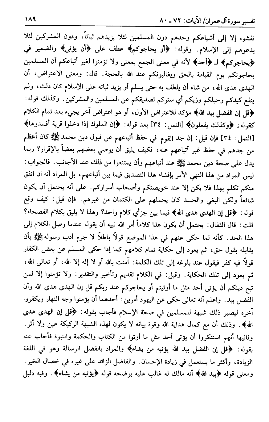 قلت: قال القفال: يحتمل أن يكون هذا كلاما أمر الله نبيه أن يقوله عند ما وصل الكلام إلى هذا الحد. كأنه لما حكى عنهم في هذا الموضع قولا باطلا لا جرم أدب رسوله صلى الله عليه وسلم بأن يقابله بقول حق، ثم يعود إلى حكاية تمام كلامهم كما إذا حكى المسلم عن بعض الكفار قولا فيه كفر فيقول عند بلوغه إلى تلك الكلمة: آمنت بالله أو لا إله إلا الله، أو تعالى الله، ثم يعود إلى تلك الحكاية. وقيل: في الكلام تقديم وتأخير والتقدير: ولا تؤمنوا إلا لمن تبع دينكم أن يؤتى أحد مثل ما أوتيتم أو يحاجوكم عند ربكم قل إن الهدى هدى الله وأن الفضل بيد. واعلم أنه تعالى حكى عن اليهود أمرين: أحدهما أن يؤمنوا وجه النهار ويكفروا آخره ليصير ذلك شبهة للمسلمين في صحة الإسلام فأجاب بقوله: قُلْ إِنَّ الْهُدى هُدَى اللَّهِ. وذلك أن مع كمال هداية الله وقوة بيانه لا يكون لهذه الشبهة الركيكة عين ولا أثر.