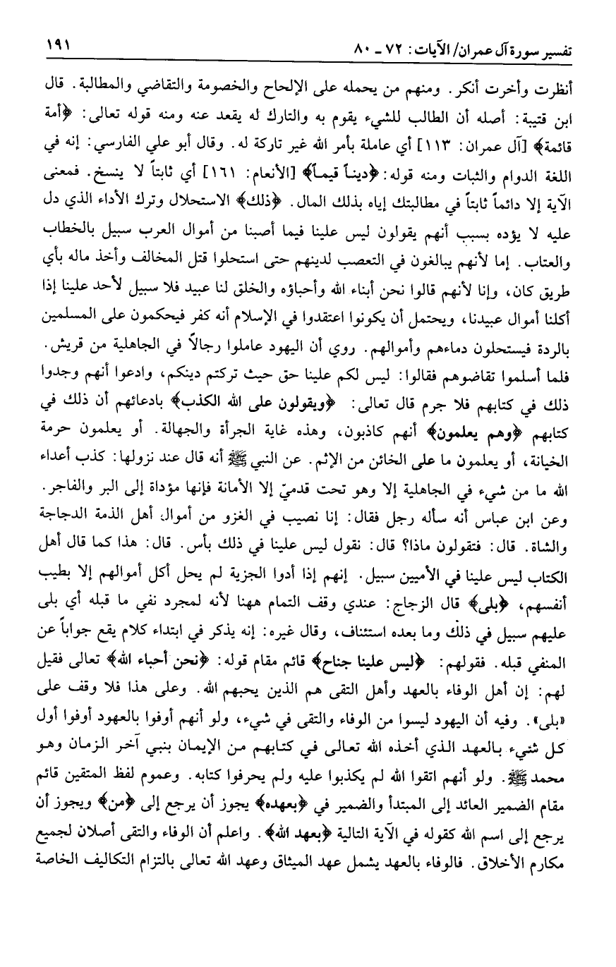 أنظرت وأخرت أنكر. ومنهم من يحمله على الإلحاح والخصومة والتقاضي والمطالبة. قال ابن قتيبة: أصله أن الطالب للشيء يقوم به والتارك له يقعد عنه ومنه قوله تعالى: أُمَّةٌ قائِمَةٌ [آل عمران: 113] أي عاملة بأمر الله غير تاركة له. وقال أبو علي الفارسي: إنه في اللغة الدوام والثبات ومنه قوله: دِيناً قِيَماً [الأنعام: 161] أي ثابتا لا ينسخ. فمعنى الآية إلا دائما ثابتا في مطالبتك إياه بذلك المال. ذلِكَ الاستحلال وترك الأداء الذي دل عليه لا يؤده بسبب أنهم يقولون ليس علينا فيما أصبنا من أموال العرب سبيل بالخطاب والعتاب. إما لأنهم يبالغون في التعصب لدينهم حتى استحلوا قتل المخالف وأخذ ماله بأي طريق كان، وإنا لأنهم قالوا نحن أبناء الله وأحباؤه والخلق لنا عبيد فلا سبيل لأحد علينا إذا أكلنا أموال عبيدنا، ويحتمل أن يكونوا اعتقدوا في الإسلام أنه كفر فيحكمون على المسلمين بالردة فيستحلون دماءهم وأموالهم.