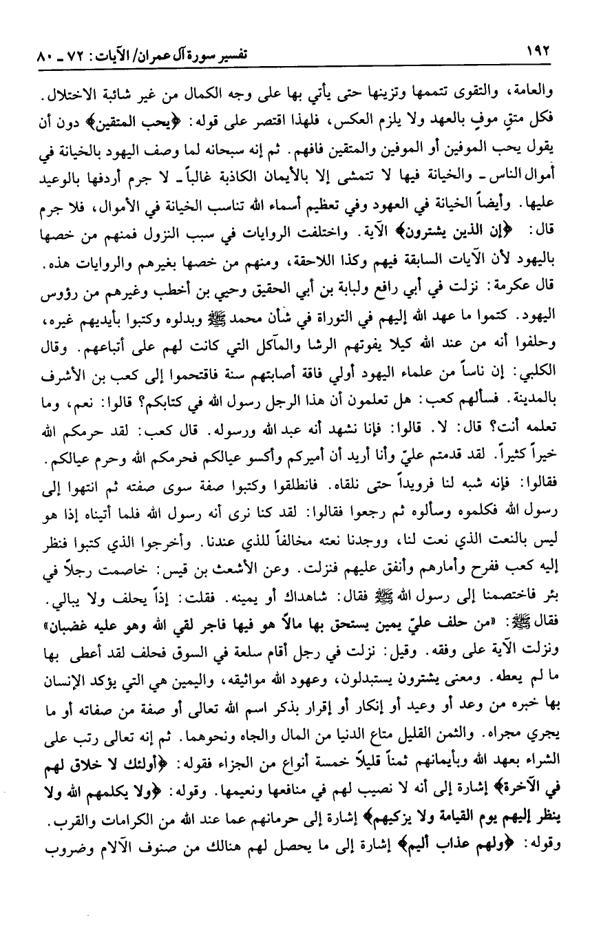فكل متق موف بالعهد ولا يلزم العكس، فلهذا اقتصر على قوله: يُحِبُّ الْمُتَّقِينَ دون أن يقول يحب الموفين أو الموفين والمتقين فافهم. ثم إنه سبحانه لما وصف اليهود بالخيانة في أموال الناس- والخيانة فيها لا تتمشى إلا بالأيمان الكاذبة غالبا- لا جرم أردفها بالوعيد عليها. وأيضا الخيانة في العهود وفي تعظيم أسماء الله تناسب الخيانة في الأموال، فلا جرم قال: إِنَّ الَّذِينَ يَشْتَرُونَ الآية. واختلفت الروايات في سبب النزول فمنهم من خصها باليهود لأن الآيات السابقة فيهم وكذا اللاحقة، ومنهم من خصها بغيرهم والروايات هذه.