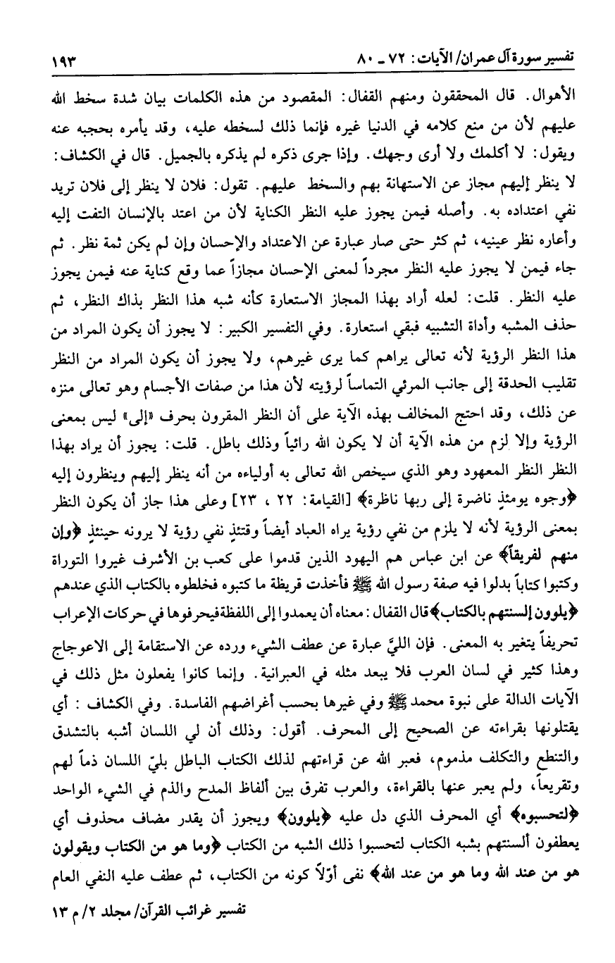 لا ينظر إليهم مجاز عن الاستهانة بهم والسخط عليهم. تقول: فلان لا ينظر إلى فلان تريد نفي اعتداده به. وأصله فيمن يجوز عليه النظر الكناية لأن من اعتد بالإنسان التفت إليه وأعاره نظر عينيه، ثم كثر حتى صار عبارة عن الاعتداد والإحسان وإن لم يكن ثمة نظر. ثم جاء فيمن لا يجوز عليه النظر مجردا لمعنى الإحسان مجازا عما وقع كناية عنه فيمن يجوز عليه النظر. قلت: لعله أراد بهذا المجاز الاستعارة كأنه شبه هذا النظر بذاك النظر، ثم حذف المشبه وأداة التشبيه فبقي استعارة. وفي التفسير الكبير: لا يجوز أن يكون المراد من هذا النظر الرؤية لأنه تعالى يراهم كما يرى غيرهم، ولا يجوز أن يكون المراد من النظر تقليب الحدقة إلى جانب المرئي التماسا لرؤيته لأن هذا من صفات الأجسام وهو تعالى منزه عن ذلك، وقد احتج المخالف بهذه الآية على أن النظر المقرون بحرف «إلى» ليس بمعنى الرؤية وإلا لزم من هذه الآية أن لا يكون الله رائيا وذلك باطل. قلت: يجوز أن يراد بهذا النظر النظر المعهود وهو الذي سيخص الله تعالى به أولياءه من أنه ينظر إليهم وينظرون إليه وُجُوهٌ يَوْمَئِذٍ ناضِرَةٌ إِلى رَبِّها ناظِرَةٌ [القيامة: 22، 23] وعلى هذا جاز أن يكون النظر بمعنى الرؤية لأنه لا يلزم من نفي رؤية يراه العباد أيضا وقتئذ نفي رؤية لا يرونه حينئذ وَإِنَّ مِنْهُمْ لَفَرِيقاً عن ابن عباس هم اليهود الذين قدموا على كعب بن الأشرف غيروا التوراة وكتبوا كتابا بدلوا فيه صفة رسول الله صلى الله عليه وسلم فأخذت قريظة ما كتبوه فخلطوه بالكتاب الذي عندهم يَلْوُونَ أَلْسِنَتَهُمْ بِالْكِتابِ قال القفال: معناه أن يعمدوا إلى اللفظة فيحرفونها في حركات الإعراب تحريفا يتغير به المعنى. فإن الليّ عبارة عن عطف الشيء ورده عن الاستقامة إلى الاعوجاج وهذا كثير في لسان العرب فلا يبعد مثله في العبرانية. وإنما كانوا يفعلون مثل ذلك في الآيات الدالة على نبوة محمد صلى الله عليه وسلم وفي غيرها بحسب أغراضهم الفاسدة. وفي الكشاف: أي يقتلونها بقراءته عن الصحيح إلى المحرف. أقول: وذلك أن لي اللسان أشبه بالتشدق والتنطع والتكلف مذموم، فعبر الله عن قراءتهم لذلك الكتاب الباطل بليّ اللسان ذما لهم وتقريعا، ولم يعبر عنها بالقراءة، والعرب تفرق بين ألفاظ المدح والذم في الشيء الواحد لِتَحْسَبُوهُ أي المحرف الذي دل عليه يَلْوُونَ ويجوز أن يقدر مضاف محذوف أي يعطفون ألسنتهم بشبه الكتاب لتحسبوا ذلك الشبه من الكتاب وَما هُوَ مِنَ الْكِتابِ وَيَقُولُونَ هُوَ مِنْ عِنْدِ اللَّهِ وَما هُوَ مِنْ عِنْدِ اللَّهِ نفى أوّلا كونه من الكتاب، ثم عطف عليه النفي العام
