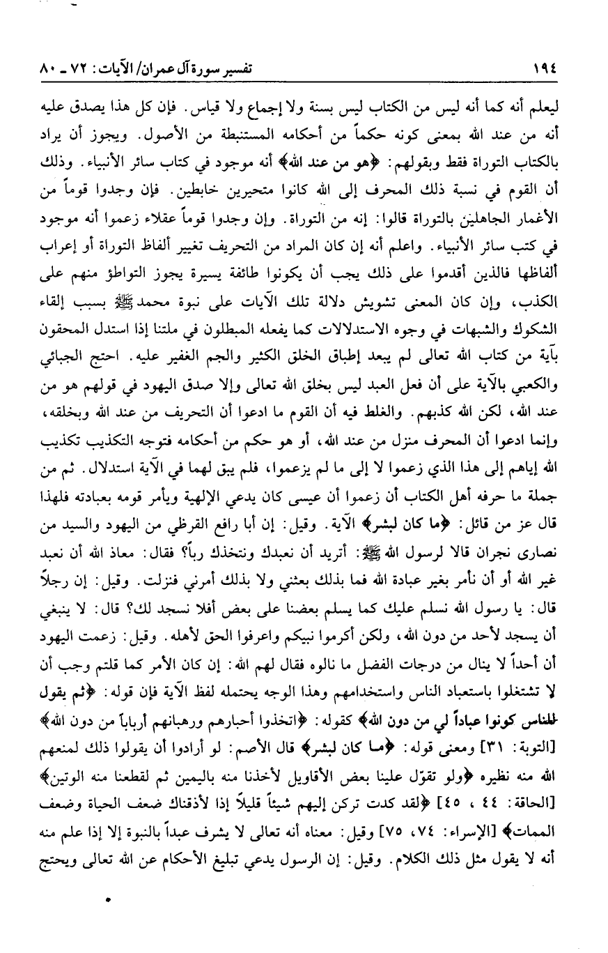 ليعلم أنه كما أنه ليس من الكتاب ليس بسنة ولا إجماع ولا قياس. فإن كل هذا يصدق عليه أنه من عند الله بمعنى كونه حكما من أحكامه المستنبطة من الأصول. ويجوز أن يراد بالكتاب التوراة فقط وبقولهم: هُوَ مِنْ عِنْدِ اللَّهِ أنه موجود في كتاب سائر الأنبياء. وذلك أن القوم في نسبة ذلك المحرف إلى الله كانوا متحيرين خابطين. فإن وجدوا قوما من الأغمار الجاهلين بالتوراة قالوا: إنه من التوراة. وإن وجدوا قوما عقلاء زعموا أنه موجود في كتب سائر الأنبياء. واعلم أنه إن كان المراد من التحريف تغيير ألفاظ التوراة أو إعراب ألفاظها فالذين أقدموا على ذلك يجب أن يكونوا طائفة يسيرة يجوز التواطؤ منهم على الكذب، وإن كان المعنى تشويش دلالة تلك الآيات على نبوة محمد صلى الله عليه وسلم بسبب إلقاء الشكوك والشبهات في وجوه الاستدلالات كما يفعله المبطلون في ملتنا إذا استدل المحقون بآية من كتاب الله تعالى لم يبعد إطباق الخلق الكثير والجم الغفير عليه. احتج الجبائي والكعبي بالآية على أن فعل العبد ليس بخلق الله تعالى وإلا صدق اليهود في قولهم هو من عند الله، لكن الله كذبهم. والغلط فيه أن القوم ما ادعوا أن التحريف من عند الله وبخلقه، وإنما ادعوا أن المحرف منزل من عند الله، أو هو حكم من أحكامه فتوجه التكذيب تكذيب الله إياهم إلى هذا الذي زعموا لا إلى ما لم يزعموا، فلم يبق لهما في الآية استدلال. ثم من جملة ما حرفه أهل الكتاب أن زعموا أن عيسى كان يدعي الإلهية ويأمر قومه بعبادته فلهذا قال عز من قائل: ما كانَ لِبَشَرٍ الآية.