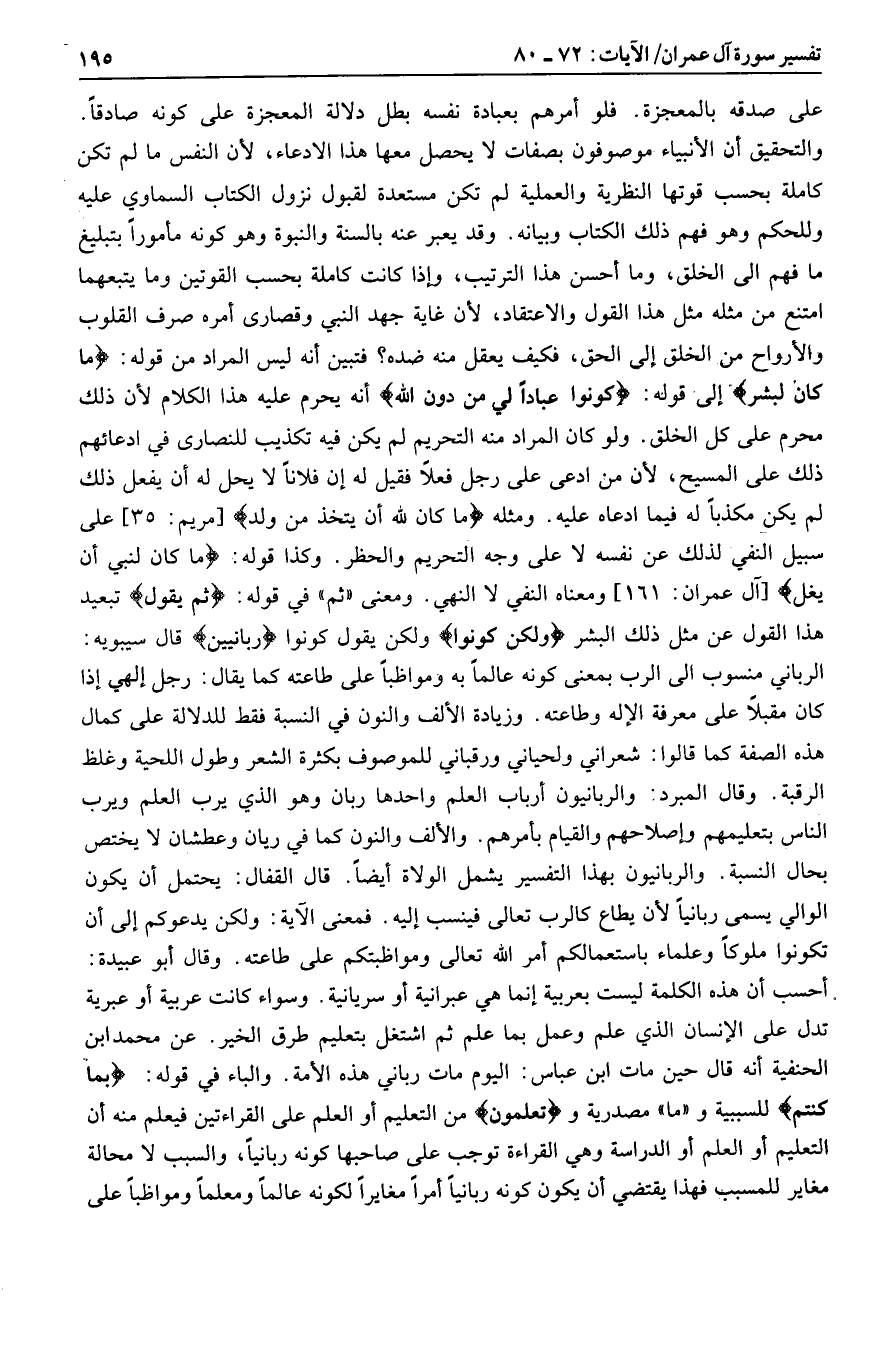 أحسب أن هذه الكلمة ليست بعربية إنما هي عبرانية أو سريانية. وسواء كانت عربية أو عبرية تدل على الإنسان الذي علم وعمل بما علم ثم اشتغل بتعليم طرق الخير. عن محمد ابن الحنفية أنه قال حين مات ابن عباس: اليوم مات رباني هذه الأمة. والباء في قوله: بِما كُنْتُمْ للسببية و «ما» مصدرية وتُعَلِّمُونَ من التعليم أو العلم على القراءتين فيعلم منه أن التعليم أو العلم أو الدراسة وهي القراءة توجب على صاحبها كونه ربانيا، والسبب لا محالة مغاير للمسبب فهذا يقتضي أن يكون كونه ربانيا أمرا مغايرا لكونه عالما ومعلما ومواظبا على