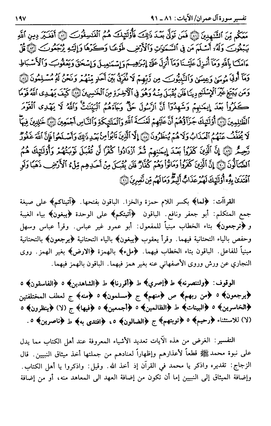 وَلَتَنْصُرُنَّهُ ط إِصْرِي ط أَقْرَرْنا ط الشَّاهِدِينَ هـ الْفاسِقُونَ هـ يُرْجَعُونَ هـ مِنْ رَبِّهِمْ ص مِنْهُمْ ج مُسْلِمُونَ هـ مِنْهُ ج لعطف المختلفتين الْخاسِرِينَ هـ الْبَيِّناتُ ط الظَّالِمِينَ هـ أَجْمَعِينَ هـ فِيها ج (لا) يُنْظَرُونَ هـ (لا) للاستثناء رَحِيمٌ هـ تَوْبَتُهُمْ ج الضَّالُّونَ هـ، افْتَدى بِهِ ط ناصِرِينَ هـ.