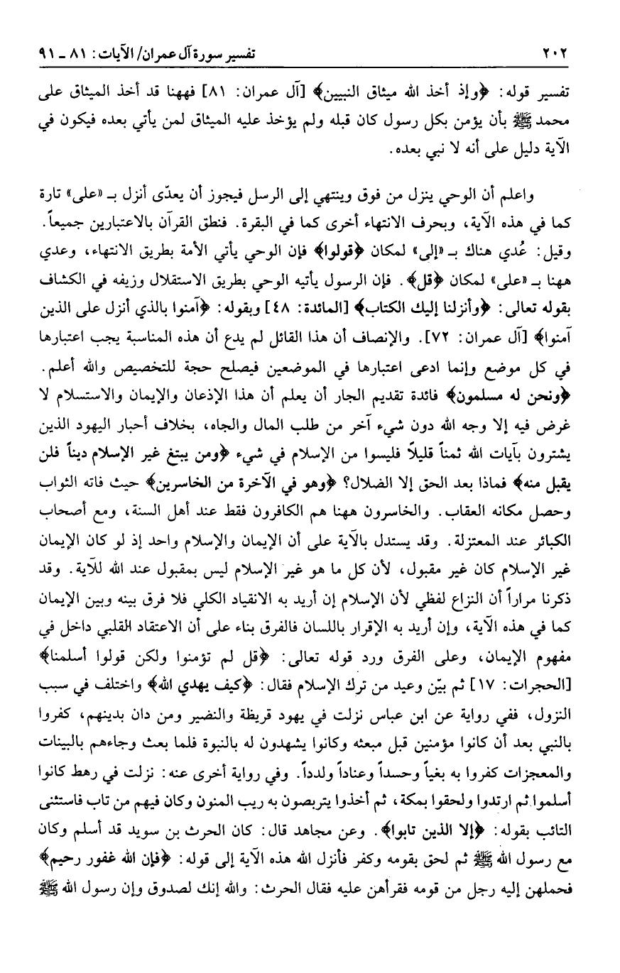 وَنَحْنُ لَهُ مُسْلِمُونَ فائدة تقديم الجار أن يعلم أن هذا الإذعان والإيمان والاستسلام لا غرض فيه إلا وجه الله دون شيء آخر من طلب المال والجاه، بخلاف أحبار اليهود الذين يشترون بآيات الله ثمنا قليلا فليسوا من الإسلام في شيء وَمَنْ يَبْتَغِ غَيْرَ الْإِسْلامِ دِيناً فَلَنْ يُقْبَلَ مِنْهُ فماذا بعد الحق إلا الضلال؟ وَهُوَ فِي الْآخِرَةِ مِنَ الْخاسِرِينَ حيث فاته الثواب وحصل مكانه العقاب. والخاسرون هاهنا هم الكافرون فقط عند أهل السنة، ومع أصحاب الكبائر عند المعتزلة. وقد يستدل بالآية على أن الإيمان والإسلام واحد إذ لو كان الإيمان غير الإسلام كان غير مقبول، لأن كل ما هو غير الإسلام ليس بمقبول عند الله للآية. وقد ذكرنا مرارا أن النزاع لفظي لأن الإسلام إن أريد به الانقياد الكلي فلا فرق بينه وبين الإيمان كما في هذه الآية، وإن أريد به الإقرار باللسان فالفرق بناء على أن الاعتقاد القلبي داخل في مفهوم الإيمان، وعلى الفرق ورد قوله تعالى: قُلْ لَمْ تُؤْمِنُوا وَلكِنْ قُولُوا أَسْلَمْنا [الحجرات: 17] ثم بيّن وعيد من ترك الإسلام فقال: كَيْفَ يَهْدِي اللَّهُ واختلف في سبب النزول، ففي رواية عن ابن عباس نزلت في يهود قريظة والنضير ومن دان بدينهم، كفروا بالنبي بعد أن كانوا مؤمنين قبل مبعثه وكانوا يشهدون له بالنبوة فلما بعث وجاءهم بالبينات والمعجزات كفروا به بغيا وحسدا وعنادا ولددا. وفي رواية أخرى عنه: نزلت في رهط كانوا أسلموا ثم ارتدوا ولحقوا بمكة، ثم أخذوا يتربصون به ريب المنون وكان فيهم من تاب فاستثنى التائب بقوله: إِلَّا الَّذِينَ تابُوا. وعن مجاهد قال: كان الحرث بن سويد قد أسلم وكان مع رسول الله صلى الله عليه وسلم ثم لحق بقومه وكفر فأنزل الله هذه الآية إلى قوله: فَإِنَّ اللَّهَ غَفُورٌ رَحِيمٌ فحملهن إليه رجل من قومه فقرأهن عليه فقال الحرث: والله إنك لصدوق وإن رسول الله صلى الله عليه وسلم