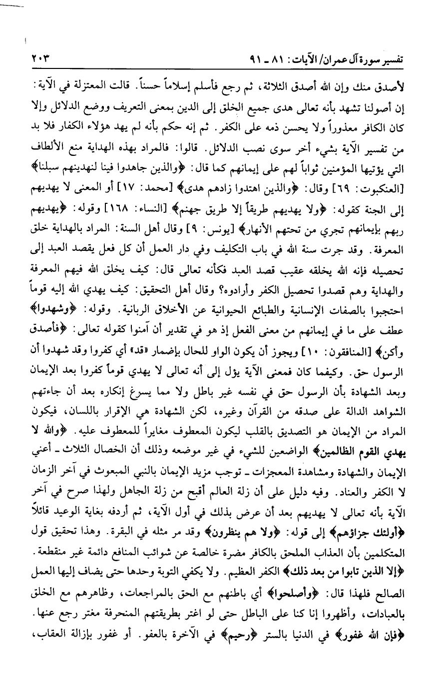 إن أصولنا تشهد بأنه تعالى هدى جميع الخلق إلى الدين بمعنى التعريف ووضع الدلائل وإلا كان الكافر معذورا ولا يحسن ذمه على الكفر. ثم إنه حكم بأنه لم يهد هؤلاء الكفار فلا بد من تفسير الآية بشيء أخر سوى نصب الدلائل. قالوا: فالمراد بهذه الهداية منع الألطاف التي يؤتيها المؤمنين ثوابا لهم على إيمانهم كما قال: وَالَّذِينَ جاهَدُوا فِينا لَنَهْدِيَنَّهُمْ سُبُلَنا [العنكبوت: 69] وقال: وَالَّذِينَ اهْتَدَوْا زادَهُمْ هُدىً [محمد: 17] أو المعنى لا يهديهم إلى الجنة كقوله: وَلا لِيَهْدِيَهُمْ طَرِيقاً إِلَّا طَرِيقَ جَهَنَّمَ [النساء: 168] وقوله: يَهْدِيهِمْ رَبُّهُمْ بِإِيمانِهِمْ تَجْرِي مِنْ تَحْتِهِمُ الْأَنْهارُ [يونس: 9] وقال أهل السنة: المراد بالهداية خلق المعرفة. وقد جرت سنة الله في باب التكليف وفي دار العمل أن كل فعل يقصد العبد إلى تحصيله فإنه الله يخلقه عقيب قصد العبد فكأنه تعالى قال: كيف يخلق الله فيهم المعرفة والهداية وهم قصدوا تحصيل الكفر وأرادوه؟ وقال أهل التحقيق: كيف يهدي الله إليه قوما احتجبوا بالصفات الإنسانية والطبائع الحيوانية عن الأخلاق الربانية. وقوله: وَشَهِدُوا عطف على ما في إيمانهم من معنى الفعل إذ هو في تقدير أن آمنوا كقوله تعالى: فَأَصَّدَّقَ وَأَكُنْ [المنافقون: 10] ويجوز أن يكون الواو للحال بإضمار «قد» أي كفروا وقد شهدوا أن الرسول حق. وكيفما كان فمعنى الآية يؤل إلى أنه تعالى لا يهدي قوما كفروا بعد الإيمان وبعد الشهادة بأن الرسول حق في نفسه غير باطل ولا مما يسوغ إنكاره بعد أن جاءتهم الشواهد الدالة على صدقه من القرآن وغيره، لكن الشهادة هي الإقرار باللسان، فيكون المراد من الإيمان هو التصديق بالقلب ليكون المعطوف مغايرا للمعطوف عليه. وَاللَّهُ لا يَهْدِي الْقَوْمَ الظَّالِمِينَ الواضعين للشيء في غير موضعه وذلك أن الخصال الثلاث- أعني الإيمان والشهادة ومشاهدة المعجزات- توجب مزيد الإيمان بالنبي المبعوث في آخر الزمان لا الكفر والعناد. وفيه دليل على أن زلة العالم أقبح من زلة الجاهل ولهذا صرح في آخر الآية بأنه تعالى لا يهديهم بعد أن عرض بذلك في أول الآية، ثم أردفه بغاية الوعيد قائلا أُولئِكَ جَزاؤُهُمْ إلى قوله: وَلا هُمْ يُنْظَرُونَ وقد مر مثله في البقرة. وهذا تحقيق قول المتكلمين بأن العذاب الملحق بالكافر مضرة خالصة عن شوائب المنافع دائمة غير منقطعة.
