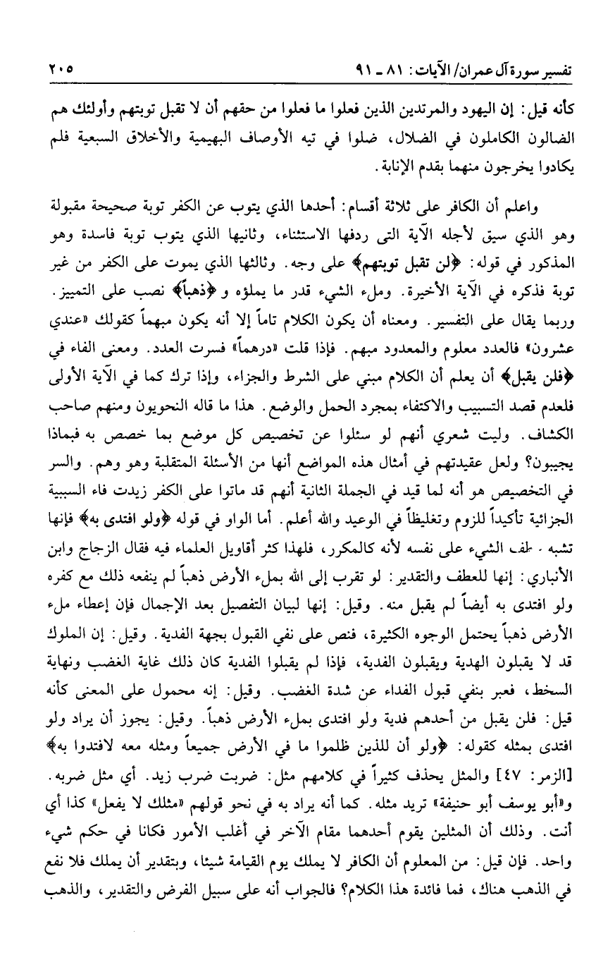 وربما يقال على التفسير. ومعناه أن يكون الكلام تاما إلا أنه يكون مبهما كقولك «عندي عشرون» فالعدد معلوم والمعدود مبهم. فإذا قلت «درهما» فسرت العدد. ومعنى الفاء في فَلَنْ يُقْبَلَ أن يعلم أن الكلام مبني على الشرط والجزاء، وإذا ترك كما في الآية الأولى فلعدم قصد التسبيب والاكتفاء بمجرد الحمل والوضع. هذا ما قاله النحويون ومنهم صاحب الكشاف. وليت شعري أنهم لو سئلوا عن تخصيص كل موضع بما خصص به فبماذا يجيبون؟ ولعل عقيدتهم في أمثال هذه المواضع أنها من الأسئلة المتقلبة وهو وهم. والسر في التخصيص هو أنه لما قيد في الجملة الثانية أنهم قد ماتوا على الكفر زيدت فاء السببية الجزائية تأكيدا للزوم وتغليظا في الوعيد والله أعلم. أما الواو في قوله وَلَوِ افْتَدى بِهِ فإنها تشبه عطف الشيء على نفسه لأنه كالمكرر، فلهذا كثر أقاويل العلماء فيه فقال الزجاج وابن الأنباري: إنها للعطف والتقدير: لو تقرب إلى الله بملء الأرض ذهبا لم ينفعه ذلك مع كفره ولو افتدى به أيضا لم يقبل منه. وقيل: إنها لبيان التفصيل بعد الإجمال فإن إعطاء ملء الأرض ذهبا يحتمل الوجوه الكثيرة، فنص على نفي القبول بجهة الفدية. وقيل: إن الملوك قد لا يقبلون الهدية ويقبلون الفدية، فإذا لم يقبلوا الفدية كان ذلك غاية الغضب ونهاية السخط، فعبر بنفي قبول الفداء عن شدة الغضب. وقيل: إنه محمول على المعنى كأنه قيل: فلن يقبل من أحدهم فدية ولو افتدى بملء الأرض ذهبا. وقيل: يجوز أن يراد ولو افتدى بمثله كقوله: وَلَوْ أَنَّ لِلَّذِينَ ظَلَمُوا ما فِي الْأَرْضِ جَمِيعاً وَمِثْلَهُ مَعَهُ لَافْتَدَوْا بِهِ [الزمر: 47] والمثل يحذف كثيرا في كلامهم مثل: ضربت ضرب زيد. أي مثل ضربه.