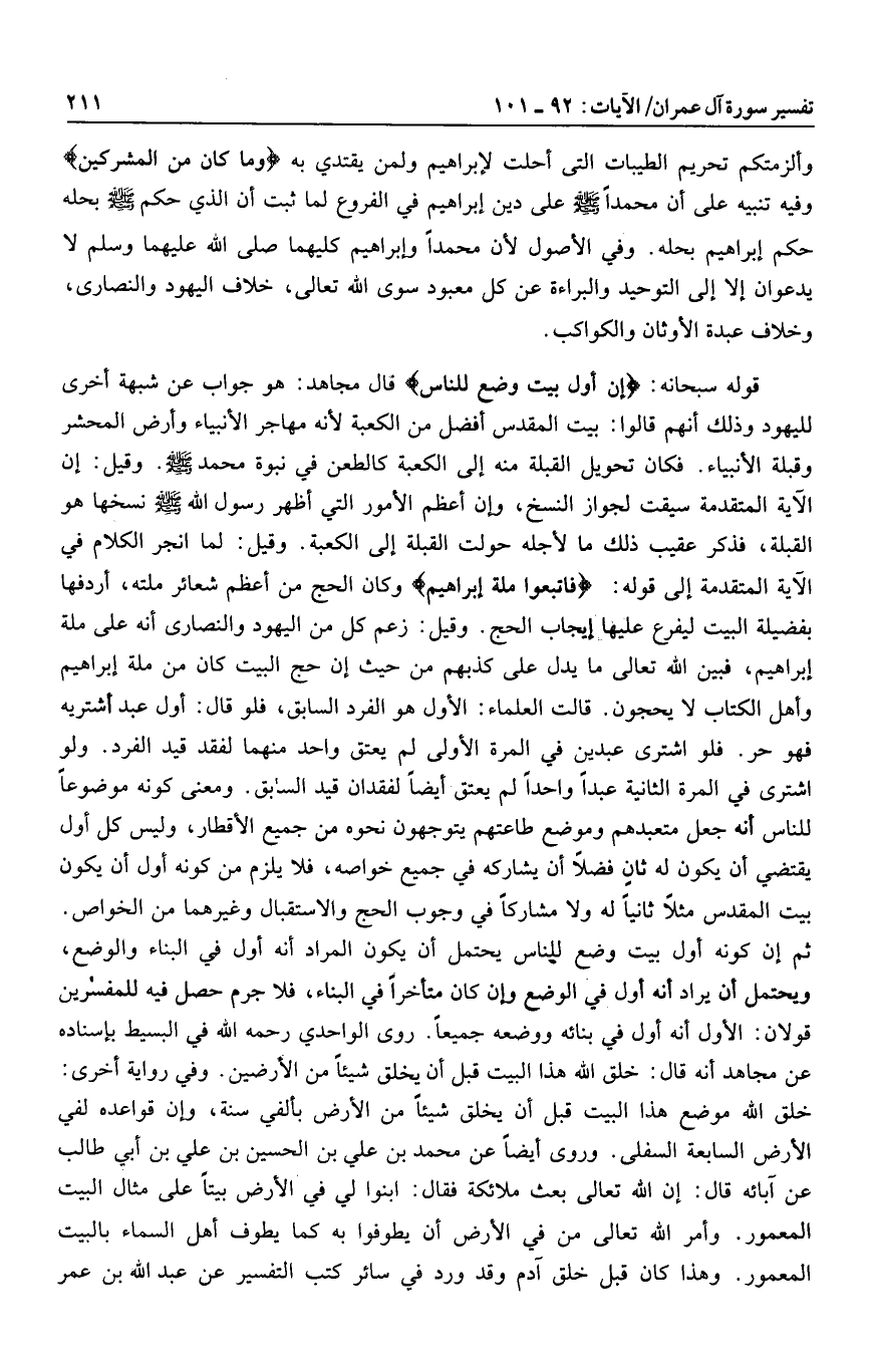 قوله سبحانه: إِنَّ أَوَّلَ بَيْتٍ وُضِعَ لِلنَّاسِ قال مجاهد: هو جواب عن شبهة أخرى لليهود وذلك أنهم قالوا: بيت المقدس أفضل من الكعبة لأنه مهاجر الأنبياء وأرض المحشر وقبلة الأنبياء. فكان تحويل القبلة منه إلى الكعبة كالطعن في نبوة محمد صلى الله عليه وسلم. وقيل: إن الآية المتقدمة سيقت لجواز النسخ، وإن أعظم الأمور التي أظهر رسول الله صلى الله عليه وسلم نسخها هو القبلة، فذكر عقيب ذلك ما لأجله حولت القبلة إلى الكعبة. وقيل: لما انجر الكلام في الآية المتقدمة إلى قوله: فَاتَّبِعُوا مِلَّةَ إِبْراهِيمَ وكان الحج من أعظم شعائر ملته، أردفها بفضيلة البيت ليفرع عليها إيجاب الحج. وقيل: زعم كل من اليهود والنصارى أنه على ملة إبراهيم، فبين الله تعالى ما يدل على كذبهم من حيث إن حج البيت كان من ملة إبراهيم وأهل الكتاب لا يحجون. قالت العلماء: الأول هو الفرد السابق، فلو قال: أول عبد أشتريه فهو حر. فلو اشترى عبدين في المرة الأولى لم يعتق واحد منهما لفقد قيد الفرد. ولو اشترى في المرة الثانية عبدا واحدا لم يعتق أيضا لفقدان قيد السابق. ومعنى كونه موضوعا للناس أنه جعل متعبدهم وموضع طاعتهم يتوجهون نحوه من جميع الأقطار، وليس كل أول يقتضي أن يكون له ثان فضلا أن يشاركه في جميع خواصه، فلا يلزم من كونه أول أن يكون بيت المقدس مثلا ثانيا له ولا مشاركا في وجوب الحج والاستقبال وغيرهما من الخواص.