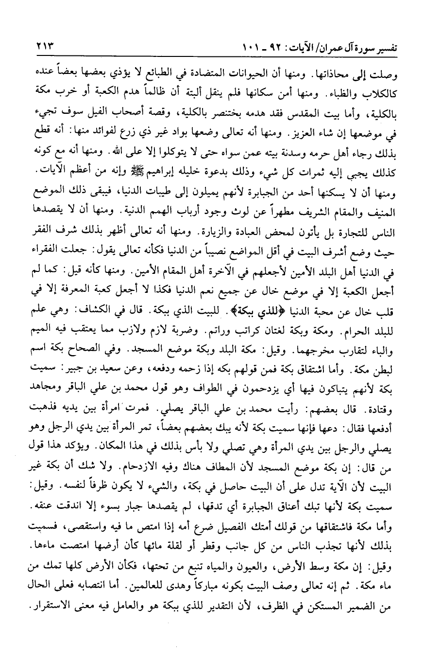 ومنها أن لا يسكنها أحد من الجبابرة لأنهم يميلون إلى طيبات الدنيا، فيبقى ذلك الموضع المنيف والمقام الشريف مطهرا عن لوث وجود أرباب الهمم الدنية. ومنها أن لا يقصدها الناس للتجارة بل يأتون لمحض العبادة والزيارة. ومنها أنه تعالى أظهر بذلك شرف الفقر حيث وضع أشرف البيت في أقل المواضع نصيبا من الدنيا فكأنه تعالى يقول: جعلت الفقراء في الدنيا أهل البلد الأمين لأجعلهم في الآخرة أهل المقام الأمين. ومنها كأنه قيل: كما لم أجعل الكعبة إلا في موضع خال عن جميع نعم الدنيا فكذا لا أجعل كعبة المعرفة إلا في قلب خال عن محبة الدنيا لَلَّذِي بِبَكَّةَ. للبيت الذي ببكة. قال في الكشاف: وهي علم للبلد الحرام. ومكة وبكة لغتان كراتب وراتم. وضربة لازم ولازب مما يعتقب فيه الميم والباء لتقارب مخرجهما. وقيل: مكة البلد وبكة موضع المسجد. وفي الصحاح بكة اسم لبطن مكة. وأما اشتقاق بكة فمن قولهم بكه إذا زحمه ودفعه، وعن سعيد بن جبير: سميت بكة لأنهم يتباكون فيها أي يزدحمون في الطواف وهو قول محمد بن علي الباقر ومجاهد وقتادة. قال بعضهم: رأيت محمد بن علي الباقر يصلي. فمرت امرأة بين يديه فذهبت أدفعها فقال: دعها فإنها سميت بكة لأنه يبك بعضهم بعضا، تمر المرأة بين يدي الرجل وهو يصلي والرجل بين يدي المرأة وهي تصلي ولا بأس بذلك في هذا المكان. ويؤكد هذا قول من قال: إن بكة موضع المسجد لأن المطاف هناك وفيه الازدحام. ولا شك أن بكة غير البيت لأن الآية تدل على أن البيت حاصل في بكة، والشيء لا يكون ظرفا لنفسه. وقيل: