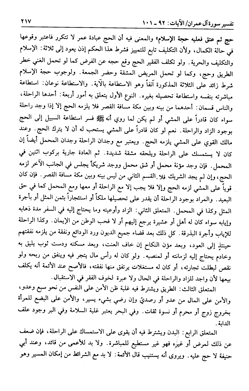 نعم لو كان قادرا على المشي يستحب له أن لا يترك الحج. وعند مالك القوي على المشي يلزمه الحج. ويعتبر مع وجدان الراحلة وجدان المحمل أيضا إن كان لا يستمسك على الراحلة ويلحقه مشقة شديدة. ثم العادة جارية بركوب اثنين في المحمل. فإن وجد مؤنة محمل أو شق محمل ووجد شريكا يجلس في الجانب الآخر لزمه الحج، وإن لم يجد الشريك فلا. القسم الثاني من ليس بينه وبين مكة مسافة القصر. فإن كان قويا على المشي لزمه الحج وإلا فلا يجب إلا مع الراحلة أو معها ومع المحمل كما في حق البعيد. والمراد بوجود الراحلة أن يقدر على تحصيلها ملكا أو استئجارا بثمن المثل أو بأجرة المثل وكذا في المحمل. المتعلق الثاني: الزاد وأوعيته وما يحتاج إليه في السفر مدة ذهابه وإيابه سواء كان له أهل أو عشيرة يرجع إليهم أو لا فحب الوطن من الإيمان. وكذا الراحلة للإياب وأجرة البذرقة. كل ذلك بعد قضاء جميع الديون ورد الودائع ونفقة من يلزمه نفقتهم حينئذ إلى العود، وبعد مؤن النكاح إن خاف العنت، وبعد مسكنه ودست ثوب يليق به وخادم يحتاج إليه لزمانته أو لمنصبه. ولو كان له رأس مال يتجر فيه وينفق من ربحه ولو نقص لبطلت تجارته، أو كان له مستغلات يرتفق منها نفقته، فالأصح عند الأئمة أنه يكلف بيعها لأن واجد للزاد والراحلة في الحال ولا عبرة لخوف الفقر في الاستقبال.