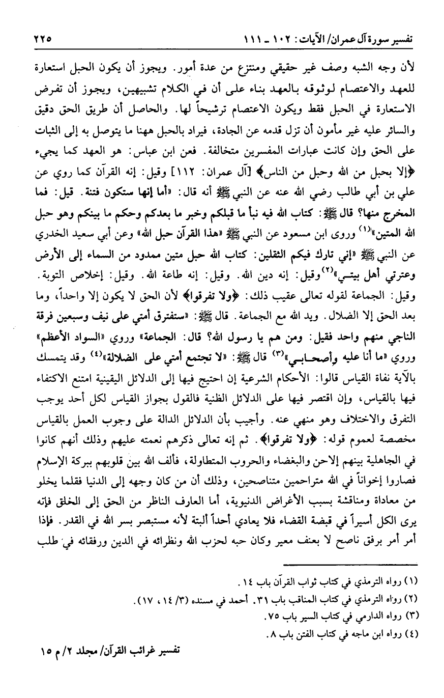 وقد يتمسك بالآية نفاة القياس قالوا: الأحكام الشرعية إن احتيج فيها إلى الدلائل اليقينية امتنع الاكتفاء فيها بالقياس، وإن اقتصر فيها على الدلائل الظنية فالقول بجواز القياس لكل أحد يوجب التفرق والاختلاف وهو منهي عنه. وأجيب بأن الدلائل الدالة على وجوب العمل بالقياس مخصصة لعموم قوله: وَلا تَفَرَّقُوا. ثم إنه تعالى ذكرهم نعمته عليهم وذلك أنهم كانوا في الجاهلية بينهم إلا حن والبغضاء والحروب المتطاولة، فألف الله بين قلوبهم ببركة الإسلام فصاروا إخوانا في الله متراحمين متناصحين، وذلك أن من كان وجهه إلى الدنيا فقلما يخلو من معاداة ومناقشة بسبب الأغراض الدنيوية، أما العارف الناظر من الحق إلى الخلق فإنه يرى الكل أسيرا في قبضة القضاء فلا يعادي أحدا البتة لأنه مستبصر بسر الله في القدر. فإذا أمر أمر برفق ناصح لا بعنف معير وكان حبه لحزب الله ونظرائه في الدين ورفقائه في طلب