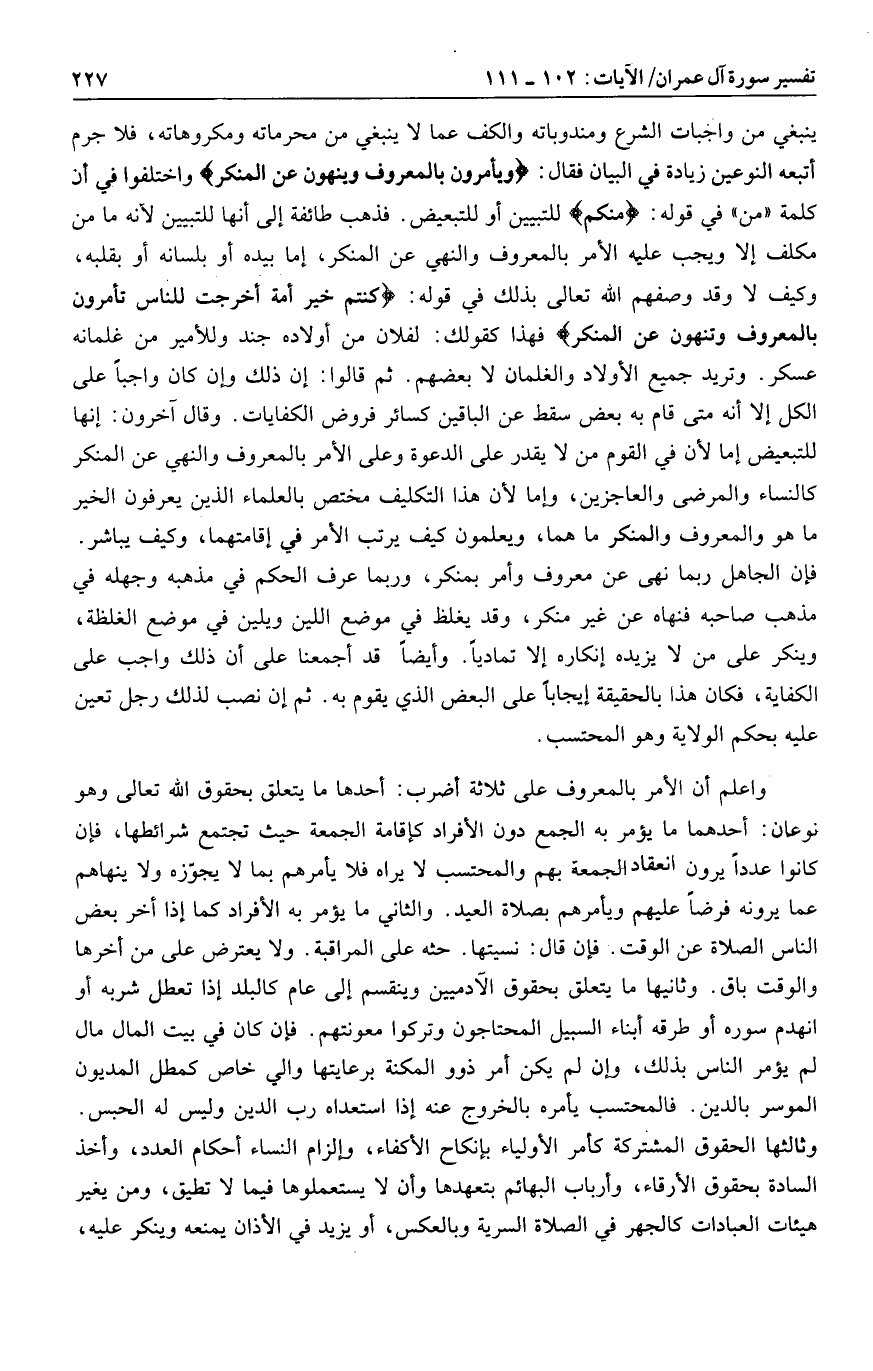 ينبغي من واجبات الشرع ومندوباته والكف عما لا ينبغي من محرماته ومكروهاته، فلا جرم أتبعه النوعين زيادة في البيان فقال: وَيَأْمُرُونَ بِالْمَعْرُوفِ وَيَنْهَوْنَ عَنِ الْمُنْكَرِ واختلفوا في أن كلمة «من» في قوله: مِنْكُمْ للتبيين أو للتبعيض. فذهب طائفة إلى أنها للتبيين لأنه ما من مكلف إلا ويجب عليه الأمر بالمعروف والنهي عن المنكر، إما بيده أو بلسانه أو بقلبه، وكيف لا وقد وصفهم الله تعالى بذلك في قوله: كُنْتُمْ خَيْرَ أُمَّةٍ أُخْرِجَتْ لِلنَّاسِ تَأْمُرُونَ بِالْمَعْرُوفِ وَتَنْهَوْنَ عَنِ الْمُنْكَرِ فهذا كقولك: لفلان من أولاده جند وللأمير من غلمانه عسكر. وتريد جميع الأولاد والغلمان لا بعضهم. ثم قالوا: إن ذلك وإن كان واجبا على الكل إلا أنه متى قام به بعض سقط عن الباقين كسائر فروض الكفايات. وقال آخرون: إنها للتبعيض إما لأن في القوم من لا يقدر على الدعوة وعلى الأمر بالمعروف والنهي عن المنكر كالنساء والمرضى والعاجزين، وإما لأن هذا التكليف مختص بالعلماء الذين يعرفون الخير ما هو والمعروف والمنكر ما هما، ويعلمون كيف يرتب الأمر في إقامتهما، وكيف يباشر.