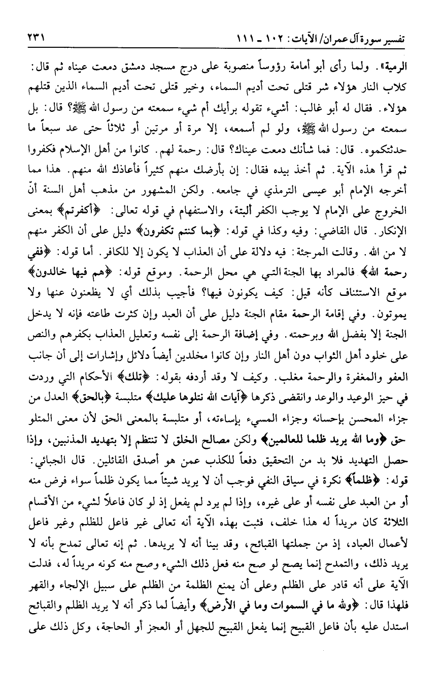 كلاب النار هؤلاء شر قتلى تحت أديم السماء، وخير قتلى تحت أديم السماء الذين قتلهم هؤلاء. فقال له أبو غالب: أشيء تقوله برأيك أم شيء سمعته من رسول الله صلى الله عليه وسلم؟ قال: بل سمعته من رسول الله صلى الله عليه وسلم، ولو لم أسمعه، إلا مرة أو مرتين أو ثلاثا حتى عد سبعا ما حدثتكموه. قال: فما شأنك دمعت عيناك؟ قال: رحمة لهم. كانوا من أهل الإسلام فكفروا ثم قرأ هذه الآية. ثم أخذ بيده فقال: إن بأرضك منهم كثيرا فأعاذك الله منهم. هذا مما أخرجه الإمام أبو عيسى الترمذي في جامعه. ولكن المشهور من مذهب أهل السنة أنّ الخروج على الإمام لا يوجب الكفر البتة، والاستفهام في قوله تعالى: أَكَفَرْتُمْ بمعنى الإنكار. قال القاضي: وفيه وكذا في قوله: بِما كُنْتُمْ تَكْفُرُونَ دليل على أن الكفر منهم لا من الله. وقالت المرجئة: فيه دلالة على أن العذاب لا يكون إلا للكافر. أما قوله: فَفِي رَحْمَتِ اللَّهِ فالمراد بها الجنة التي هي محل الرحمة. وموقع قوله: هُمْ فِيها خالِدُونَ موقع الاستئناف كأنه قيل: كيف يكونون فيها؟ فأجيب بذلك أي لا يظعنون عنها ولا يموتون. وفي إقامة الرحمة مقام الجنة دليل على أن العبد وإن كثرت طاعته فإنه لا يدخل الجنة إلا بفضل الله وبرحمته. وفي إضافة الرحمة إلى نفسه وتعليل العذاب بكفرهم والنص على خلود أهل الثواب دون أهل النار وإن كانوا مخلدين أيضا دلائل وإشارات إلى أن جانب العفو والمغفرة والرحمة مغلب. وكيف لا وقد أردفه بقوله: تِلْكَ الأحكام التي وردت في حيز الوعيد والوعد وانقضى ذكرها آياتُ اللَّهِ نَتْلُوها عَلَيْكَ متلبسة بِالْحَقِّ العدل من جزاء المحسن بإحسانه وجزاء المسيء بإساءته، أو متلبسة بالمعنى الحق لأن معنى المتلو حق وَمَا اللَّهُ يُرِيدُ ظُلْماً لِلْعالَمِينَ ولكن مصالح الخلق لا تنتظم إلا بتهديد المذنبين، وإذا حصل التهديد فلا بد من التحقيق دفعا للكذب عمن هو أصدق القائلين. قال الجبائي: