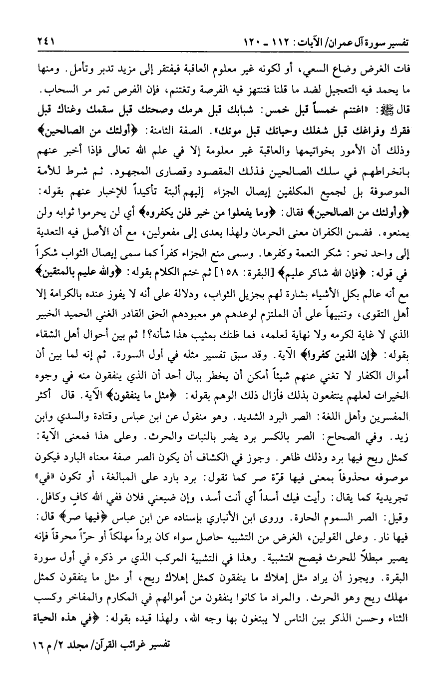 وَأُولئِكَ مِنَ الصَّالِحِينَ فقال: وَما يَفْعَلُوا مِنْ خَيْرٍ فَلَنْ يُكْفَرُوهُ أي لن يحرموا ثوابه ولن يمنعوه. فضمن الكفران معنى الحرمان ولهذا يعدى إلى مفعولين، مع أن الأصل فيه التعدية إلى واحد نحو: شكر النعمة وكفرها. وسمى منع الجزاء كفرا كما سمى إيصال الثواب شكرا في قوله: فَإِنَّ اللَّهَ شاكِرٌ عَلِيمٌ [البقرة: 158] ثم ختم الكلام بقوله: وَاللَّهُ عَلِيمٌ بِالْمُتَّقِينَ مع أنه عالم بكل الأشياء بشارة لهم بجزيل الثواب، ودلالة على أنه لا يفوز عنده بالكرامة إلا أهل التقوى، وتنبيها على أن الملتزم لوعدهم هو معبودهم الحق القادر الغني الحميد الخبير الذي لا غاية لكرمه ولا نهاية لعلمه، فما ظنك بمثيب هذا شأنه؟! ثم بين أحوال أهل الشقاء بقوله: إِنَّ الَّذِينَ كَفَرُوا الآية. وقد سبق تفسير مثله في أول السورة. ثم إنه لما بين أن أموال الكفار لا تغني عنهم شيئا أمكن أن يخطر ببال أحد أن الذي ينفقون منه في وجوه الخيرات لعلهم ينتفعون بذلك فأزال ذلك الوهم بقوله: ثَلُ ما يُنْفِقُونَ