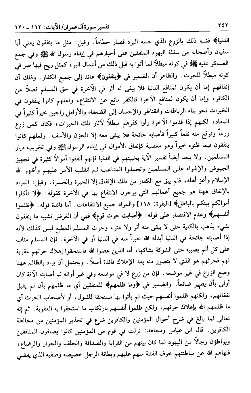 عائد إلى جميع الكفار. وذلك أن إنفاقهم إما أن يكون لمنافع الدنيا فلا يبقى له أثر في الآخرة في حق المسلم فضلا عن الكافر، وإما أن يكون لمنافع الآخرة فالكفر مانع عن الانتفاع، ولعلهم كانوا ينفقون في الخيرات نحو بناء الرباطات والقناطر والإحسان إلى الضعفاء والأرامل راجين خيرا كثيرا في المعاد، لكنهم إذا قدموا الآخرة رأوا كفرهم مبطلا لآثار تلك الخيرات، فكان كمن زرع زرعا وتوقع منه نفعا كبيرا فأصابه جائحة فلا يبقى معه إلا الحزن والأسف. ولعلهم كانوا ينفقون فيما ظنوه خيرا وهو معصية كإنفاق الأموال في إيذاء الرسول صلى الله عليه وسلم وفي تخريب ديار المسلمين. ولا يبعد أيضا تفسير الآية بخيبتهم في الدنيا فإنهم أنفقوا أموالا كثيرة في تجهيز الجيوش والإغراء على المسلمين وتحملوا المتاعب ثم انقلب الأمر عليهم وأظهر الله الإسلام وأعز أهله، فلم يبق مع الكفار من ذلك الإنفاق إلا الحيرة والحسرة. وقيل: المراد بالإنفاق هاهنا هو جميع أعمالهم التي يرجون الانتفاع بها في الآخرة كقوله: لا تَأْكُلُوا أَمْوالَكُمْ بَيْنَكُمْ بِالْباطِلِ [البقرة: 118] والمراد جميع الانتفاعات. أما فائدة قوله: لَمُوا أَنْفُسَهُمْ