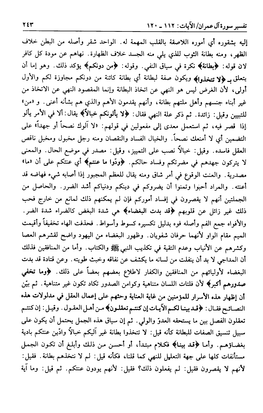 إليه بشقوره أي أموره اللاصقة بالقلب المهمة له. الواحد شقر وأصله من البطن خلاف الظهر، ومنه بطانة الثوب للذي يلي منه الجسد خلاف الظهارة. نهاهم عن مودة كل كافر لان قوله: بِطانَةً نكرة في سياق النفي. وقوله: مِنْ دُونِكُمْ يؤكد ذلك. وهو إما أن يتعلق ب لا تَتَّخِذُوا ويكون صفة لبطانة أي بطانة كائنة من دونكم مجاوزة لكم والأول أولى، لأن الغرض ليس هو النهي عن اتخاذ البطانة وإنما المقصود النهي عن الاتخاذ من غير أبناء جنسهم وأهل ملتهم بطانة، وأنهم يقدمون الأهم والذي هم بشأنه أعنى. و «من» للتبيين وقيل: زائدة. ثم ذكر علة النهي فقال: لا يَأْلُونَكُمْ خَبالًا يقال: ألا في الأمر يألو إذا قصر فيه، ثم استعمل معدى إلى مفعولين في قولهم: «لا آلوك نصحا أو جهدا» على التضمين أي لا أمنعك نصحا. والخبال الفساد والنقصان ومنه رجل مخبول ومخبل ناقص