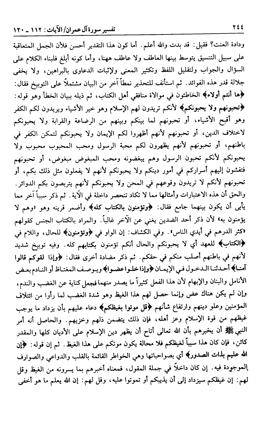 تُحِبُّونَهُمْ وَلا يُحِبُّونَكُمْ لأنكم تريدون لهم الإسلام وهو خير الأشياء ويريدون لكم الكفر وهو أقبح الأشياء، أو تحبونهم لما بينكم وبينهم من الرضاعة والقرابة ولا يحبونكم لاختلاف الدين، أو تحبونهم لأنهم أظهروا لكم الإيمان ولا يحبونكم لتمكن الكفر في باطنهم، أو تحبونهم لأنهم يظهرون لكم محبة الرسول ومحب المحبوب محبوب ولا يحبونكم لأنكم تحبون الرسول وهم يبغضونه ومحب المبغوض مبغوض، أو تحبونهم فتفشون إليهم أسراركم في أمور دينكم ولا يحبونكم لأنهم لا يفعلون مثل ذلك بكم، أو تحبونهم لأنكم لا تريدون وقوعهم في المحن ولا يحبونكم لأنهم يتربصون بكم الدوائر.