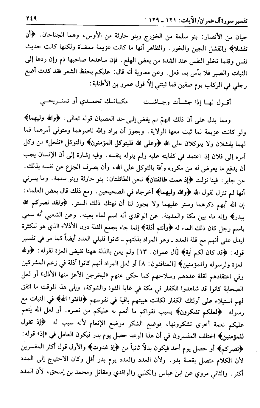 إن الله أبهم ذكرهما وستر عليهما ولا يجوز لنا أن نهتك ذلك الستر. وَلَقَدْ نَصَرَكُمُ اللَّهُ بِبَدْرٍ وإنه ماء بين مكة والمدينة. عن الواقدي أنه اسم لماء بعينه. وعن الشعبي أنه سمي باسم رجل كان ذلك الماء له وَأَنْتُمْ أَذِلَّةٌ إنما جاء بجمع القلة دون الأذلاء الذي هو للكثرة ليدل على أنهم مع قلة العدد- وهو المراد بذلتهم- كانوا قليلي العدد أيضا كما مر في تفسير قوله: قَدْ كانَ لَكُمْ آيَةٌ [آل عمران: 13] ولم يعن بالذلة هاهنا نقيض العزة لقوله: وَلِلَّهِ الْعِزَّةُ وَلِرَسُولِهِ وَلِلْمُؤْمِنِينَ [المنافقون: 8] أو لعل المراد أنهم كانوا أذلة في زعم المشركين وفي اعتقادهم لقلة عددهم وسلاحهم كما حكى عنهم «ليخرجن الأعز منها الأذل» أو لعل الصحابة كانوا قد شاهدوا الكفار في مكة في غاية القوة والشوكة، وإلى هذا الوقت ما اتفق لهم استيلاء على أولئك الكفار فكانت هيبتهم باقية في نفوسهم فَاتَّقُوا اللَّهَ في الثبات مع رسوله لَعَلَّكُمْ تَشْكُرُونَ بسبب تقواكم ما أنعم به عليكم من نصره. أو لعل الله ينعم عليكم نعمة أخرى تشكرونها، فوضع الشكر موضع الإنعام لأنه سبب له إِذْ تَقُولُ لِلْمُؤْمِنِينَ اختلف المفسرون في أن هذا الوعد حصل يوم بدر فيكون العامل في «إذ» قوله: