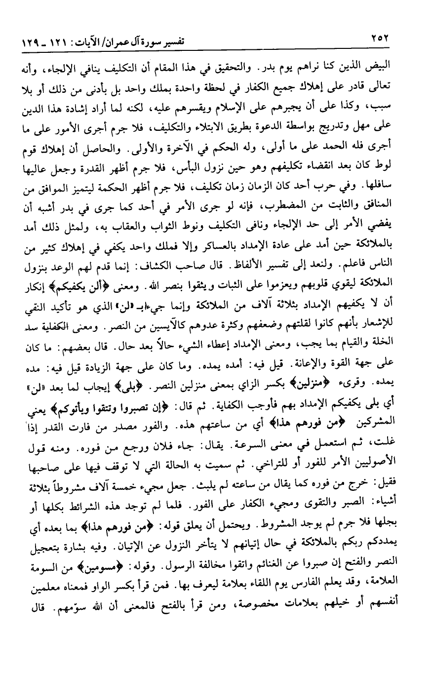 البيض الذين كنا نراهم يوم بدر. والتحقيق في هذا المقام أن التكليف ينافي الإلجاء، وأنه تعالى قادر على إهلاك جميع الكفار في لحظة واحدة بملك واحد بل بأدنى من ذلك أو بلا سبب، وكذا على أن يجبرهم على الإسلام ويقسرهم عليه، لكنه لما أراد إشادة هذا الدين على مهل وتدريج بواسطة الدعوة بطريق الابتلاء والتكليف، فلا جرم أجرى الأمور على ما أجرى فله الحمد على ما أولى، وله الحكم في الآخرة والأولى. والحاصل أن إهلاك قوم لوط كان بعد انقضاء تكليفهم وهو حين نزول البأس، فلا جرم أظهر القدرة وجعل عاليها سافلها. وفي حرب أحد كان الزمان زمان تكليف، فلا جرم أظهر الحكمة ليتميز الموافق من المنافق والثابت من المضطرب، فإنه لو جرى الأمر في أحد كما جرى في بدر أشبه أن يفضي الأمر إلى حد الإلجاء ونافى التكليف ونوط الثواب والعقاب به، ولمثل ذلك أمد بالملائكة حين أمد على عادة الإمداد بالعساكر وإلا فملك واحد يكفي في إهلاك كثير من الناس فاعلم. ولنعد إلى تفسير الألفاظ. قال صاحب الكشاف: إنما قدم لهم الوعد بنزول الملائكة ليقوي قلوبهم ويعزموا على الثبات ويثقوا بنصر الله. ومعنى أَلَنْ يَكْفِيَكُمْ إنكار أن لا يكفيهم الإمداد بثلاثة آلاف من الملائكة وإنما جيء ب «لن» الذي هو تأكيد النقي للإشعار بأنهم كانوا لقلتهم وضعفهم وكثرة عدوهم كالآيسين من النصر. ومعنى الكفاية سد الخلة والقيام بما يجب، ومعنى الإمداد إعطاء الشيء حالا بعد حال. قال بعضهم: ما كان على جهة القوة والإعانة. قيل فيه: أمده يمده. وما كان على جهة الزيادة قيل فيه: مده يمده. وقرىء مُنْزَلِينَ بكسر الزاي بمعنى منزلين النصر. بَلى إيجاب لما بعد «لن» أي بلى يكفيكم الإمداد بهم فأوجب الكفاية. ثم قال: إِنْ تَصْبِرُوا وَتَتَّقُوا وَيَأْتُوكُمْ يعني المشركين مِنْ فَوْرِهِمْ هذا أي من ساعتهم هذه. والفور مصدر من فارت القدر إذا غلت، ثم استعمل في معنى السرعة. يقال: جاء فلان ورجع من فوره. ومنه قول الأصوليين الأمر للفور أو للتراخي. ثم سميت به الحالة التي لا توقف فيها على صاحبها فقيل: خرج من فوره كما يقال من ساعته لم يلبث. جعل مجيء خمسة آلاف مشروطا بثلاثة أشياء: الصبر والتقوى ومجيء الكفار على الفور. فلما لم توجد هذه الشرائط بكلها أو بجلها فلا جرم لم يوجد المشروط. ويحتمل أن يعلق قوله: مِنْ فَوْرِهِمْ هذا بما بعده أي يمددكم ربكم بالملائكة في حال إتيانهم لا يتأخر النزول عن الإتيان. وفيه بشارة بتعجيل النصر والفتح إن صبروا عن الغنائم واتقوا مخالفة الرسول. وقوله: مُسَوِّمِينَ من السومة العلامة، وقد يعلم الفارس يوم اللقاء بعلامة ليعرف بها. فمن قرأ بكسر الواو فمعناه معلمين أنفسهم أو خيلهم بعلامات مخصوصة، ومن قرأ بالفتح فالمعنى أن الله سوّمهم. قال