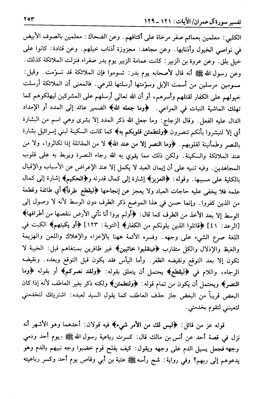 مسومين مرسلين من أسمت الإبل وسوّمتها أرسلتها للرعي. فالمعنى أن الملائكة أرسلت خيولهم على الكفار لقتلهم وأسرهم، أو أن الله تعالى أرسلهم على المشركين ليهلكوهم كما تهلك الماشية النبات في المراعي. وَما جَعَلَهُ اللَّهُ الضمير عائد إلى المدد أو الإمداد الدال عليه الفعل. وقال الزجاج: وما جعل الله ذكر المدد إلا بشرى وهي اسم من البشارة أي إلا لتبشروا بأنكم تنصرون وَلِتَطْمَئِنَّ قُلُوبُكُمْ بِهِ كما كانت السكينة لبني إسرائيل بشارة بالنصر وطمأنينة لقلوبهم. وَمَا النَّصْرُ إِلَّا مِنْ عِنْدِ اللَّهِ لا من المقاتلة إذا تكاثروا، ولا من عند الملائكة والسكينة. ولكن ذلك مما يقوي به الله رجاء النصرة ويربط به على قلوب المجاهدين. وفيه تنبيه على أن إيمان العبد لا يكمل إلا عند الإعراض عن الأسباب والإقبال بالكلية على مسببها. وقوله: الْعَزِيزِ إشارة إلى كمال قدرته والْحَكِيمِ إشارة إلى كمال علمه فلا يخفى عليه حاجات العباد ولا يعجز عن إنجاحها لِيَقْطَعَ طَرَفاً أي طائفة وقطعة من الذين كفروا. وإنما حسن في هذا الموضع ذكر الطرف دون الوسط لأنه لا وصول إلى الوسط إلا بعد الأخذ من الطرف كما قال: أَوَلَمْ يَرَوْا أَنَّا نَأْتِي الْأَرْضَ نَنْقُصُها مِنْ أَطْرافِها [الرعد: 41] قاتِلُوا الَّذِينَ يَلُونَكُمْ مِنَ الْكُفَّارِ [التوبة: 123] أَوْ يَكْبِتَهُمْ الكبت في اللغة صرع الشيء على وجهه. وفسره الأئمة هاهنا بالإخزاء والإهلاك واللعن والهزيمة والغيظ والإذلال والكل متقارب فَيَنْقَلِبُوا خائِبِينَ غير ظافرين بمبتغاهم قيل: الخيبة لا تكون إلا بعد التوقع ونقيضه الظفر. وأما اليأس فقد يكون قبل التوقع وبعده. ونقيضه الرجاء، واللام في لِيَقْطَعَ يحتمل أن يتعلق بقوله: وَلَقَدْ نَصَرَكُمُ أو بقوله وَمَا النَّصْرُ ويحتمل أن يكون من تمام قوله: وَلِتَطْمَئِنَّ ولكنه ذكر بغير العاطف لأنه إذا كان البعض قريبا من البعض جاز حذف العاطف كما يقول السيد لعبده: اشتريتك لتخدمني لتعينني لتقوم بخدمتي.