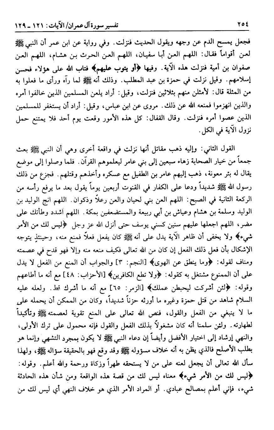 وقيل: أراد يلعن المسلمين الذين خالفوا أمره والذين انهزموا فمنعه الله عن ذلك. مروى عن ابن عباس، وقيل: أراد أن يستغفر للمسلمين الذين عصوا أمره فنزلت. وقال القفال: كل هذه الأمور وقعت يوم أحد فلا يمتنع حمل نزول الآية في الكل.