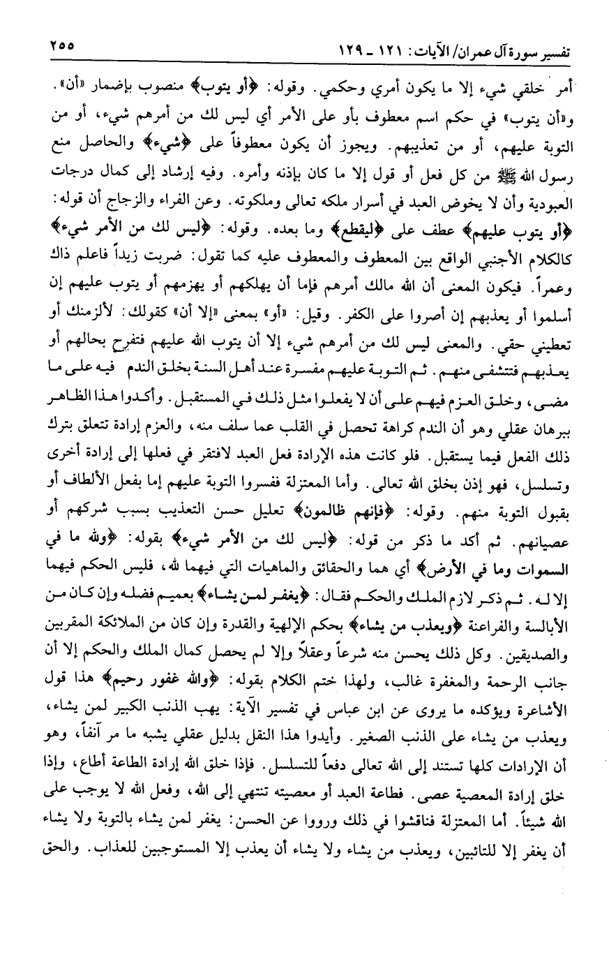 أَوْ يَتُوبَ عَلَيْهِمْ عطف على لِيَقْطَعَ وما بعده. وقوله: لَيْسَ لَكَ مِنَ الْأَمْرِ شَيْءٌ كالكلام الأجنبي الواقع بين المعطوف والمعطوف عليه كما تقول: ضربت زيدا فاعلم ذاك وعمرا. فيكون المعنى أن الله مالك أمرهم فإما أن يهلكهم أو يهزمهم أو يتوب عليهم إن أسلموا أو يعذبهم إن أصروا على الكفر. وقيل: «أو» بمعنى «إلا أن» كقولك: لألزمنك أو تعطيني حقي. والمعنى ليس لك من أمرهم شيء إلا أن يتوب الله عليهم فتفرح بحالهم أو يعذبهم فتتشفى منهم. ثم التوبة عليهم مفسرة عند أهل السنة بخلق الندم فيه على ما مضى، وخلق العزم فيهم على أن لا يفعلوا مثل ذلك في المستقبل. وأكدوا هذا الظاهر ببرهان عقلي وهو أن الندم كراهة تحصل في القلب عما سلف منه، والعزم إرادة تتعلق بترك ذلك الفعل فيما يستقبل. فلو كانت هذه الإرادة فعل العبد لافتقر في فعلها إلى إرادة أخرى وتسلسل، فهو إذن بخلق الله تعالى. وأما المعتزلة ففسروا التوبة عليهم إما بفعل الألطاف أو بقبول التوبة منهم. وقوله: فَإِنَّهُمْ ظالِمُونَ تعليل حسن التعذيب بسبب شركهم أو عصيانهم. ثم أكد ما ذكر من قوله: لَيْسَ لَكَ مِنَ الْأَمْرِ شَيْءٌ بقوله: وَلِلَّهِ ما فِي السَّماواتِ وَما فِي الْأَرْضِ أي هما والحقائق والماهيات التي فيهما لله، فليس الحكم فيهما إلا له. ثم ذكر لازم الملك والحكم فقال: يَغْفِرُ لِمَنْ يَشاءُ بعميم فضله وإن كان من الأبالسة والفراعنة وَيُعَذِّبُ مَنْ يَشاءُ بحكم الإلهية والقدرة وإن كان من الملائكة المقربين والصديقين. وكل ذلك يحسن منه شرعا وعقلا وإلا لم يحصل كمال الملك والحكم إلا أن جانب الرحمة والمغفرة غالب، ولهذا ختم الكلام بقوله: وَاللَّهُ غَفُورٌ رَحِيمٌ هذا قول الأشاعرة ويؤكده ما يروى عن ابن عباس في تفسير الآية: يهب الذنب الكبير لمن يشاء، ويعذب من يشاء على الذنب الصغير. وأيدوا هذا النقل بدليل عقلي يشبه ما مر آنفا، وهو أن الإرادات كلها تستند إلى الله تعالى دفعا للتسلسل. فإذا خلق الله إرادة الطاعة أطاع، وإذا خلق إرادة المعصية عصى. فطاعة العبد أو معصيته تنتهي إلى الله، وفعل الله لا يوجب على الله شيئا. أما المعتزلة فناقشوا في ذلك ورووا عن الحسن: يغفر لمن يشاء بالتوبة ولا يشاء أن يغفر إلا للتائبين، ويعذب من يشاء ولا يشاء أن يعذب إلا المستوجبين للعذاب. والحق