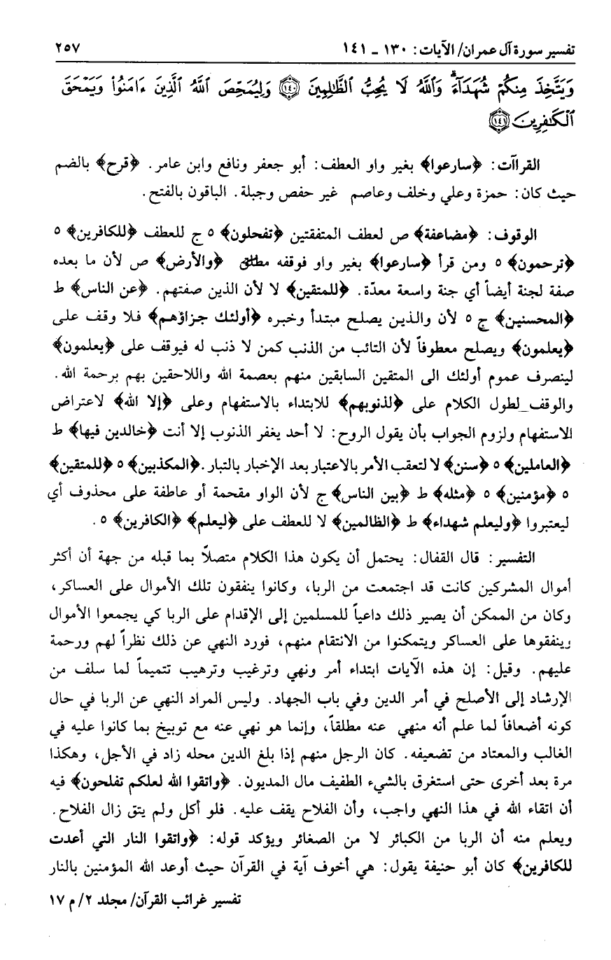 مُضاعَفَةً ص لعطف المتفقتين تُفْلِحُونَ هـ ج للعطف لِلْكافِرِينَ هـ تُرْحَمُونَ هـ ومن قرأ سارِعُوا بغير واو فوقفه مطلق وَالْأَرْضُ ص لأن ما بعده صفة لجنة أيضا أي جنة واسعة معدّة. لِلْمُتَّقِينَ لا لأن الذين صفتهم. عَنِ النَّاسِ ط الْمُحْسِنِينَ ج 5 لأن والذين يصلح مبتدأ وخبره أُولئِكَ جَزاؤُهُمْ فلا وقف على يَعْلَمُونَ ويصلح معطوفا لأن التائب من الذنب كمن لا ذنب له فيوقف على يَعْلَمُونَ لينصرف عموم أولئك إلى المتقين السابقين منهم بعصمة الله واللاحقين بهم برحمة الله.