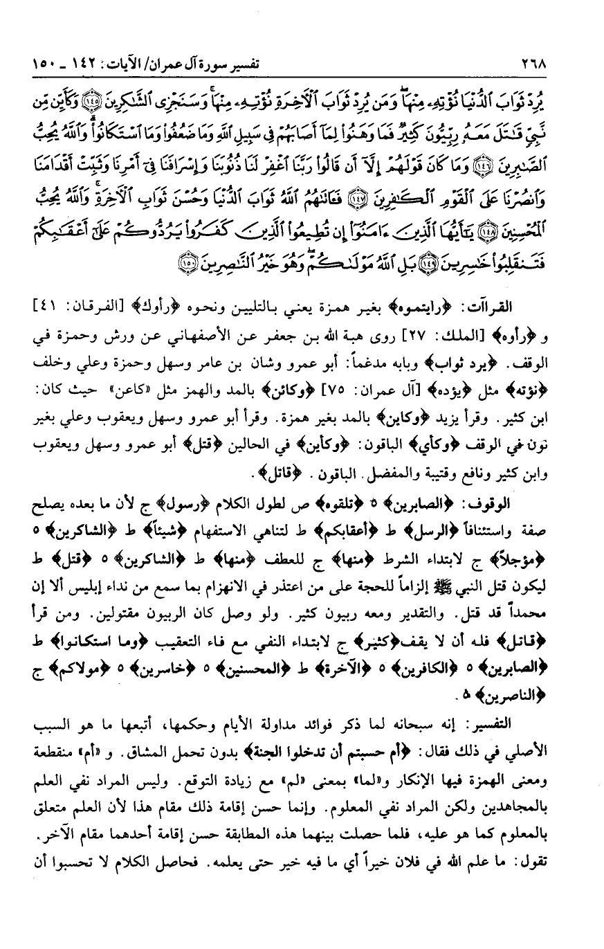 الصَّابِرِينَ هـ تَلْقَوْهُ ص لطول الكلام رَسُولٌ ج لأن ما بعده يصلح صفة واستئنافا الرُّسُلُ ط أَعْقابِكُمْ ط لتناهي الاستفهام شَيْئاً ط الشَّاكِرِينَ هـ مُؤَجَّلًا ج لابتداء الشرط مِنْها ج للعطف مِنْها ط الشَّاكِرِينَ هـ قتل ط ليكون قتل النبي صلى الله عليه وسلم إلزاما للحجة على من اعتذر في الانهزام بما سمع من نداء إبليس ألا إن محمدا قد قتل. والتقدير ومعه ربيون كثير. ولو وصل كان الربيون مقتولين. ومن قرأ قاتَلَ فله أن لا يقف كَثِيرٌ ج لابتداء النفي مع فاء التعقيب وَمَا اسْتَكانُوا ط الصَّابِرِينَ هـ الْكافِرِينَ هـ الْآخِرَةِ ط الْمُحْسِنِينَ هـ خاسِرِينَ هـ مَوْلاكُمْ ج النَّاصِرِينَ هـ.