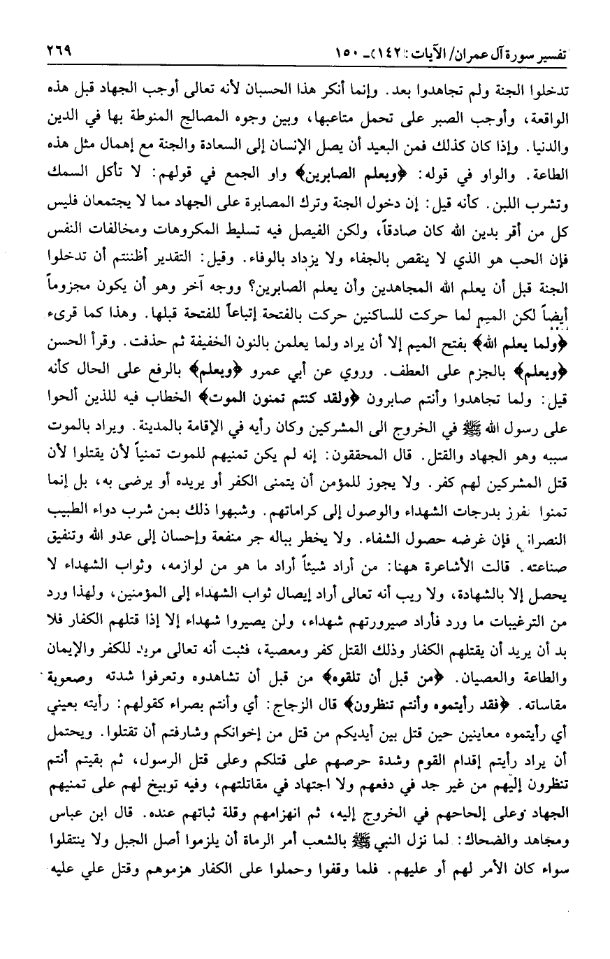 تدخلوا الجنة ولم تجاهدوا بعد. وإنما أنكر هذا الحسبان لأنه تعالى أوجب الجهاد قبل هذه الواقعة، وأوجب الصبر على تحمل متاعبها، وبين وجوه المصالح المنوطة بها في الدين والدنيا. وإذا كان كذلك فمن البعيد أن يصل الإنسان إلى السعادة والجنة مع إهمال مثل هذه الطاعة. والواو في قوله: وَيَعْلَمَ الصَّابِرِينَ واو الجمع في قولهم: لا تأكل السمك وتشرب اللبن. كأنه قيل: إن دخول الجنة وترك المصابرة على الجهاد مما لا يجتمعان فليس كل من أقر بدين الله كان صادقا، ولكن الفيصل فيه تسليط المكروهات ومخالفات النفس فإن الحب هو الذي لا ينقص بالجفاء ولا يزداد بالوفاء. وقيل: التقدير أظننتم أن تدخلوا الجنة قبل أن يعلم الله المجاهدين وأن يعلم الصابرين؟ ووجه آخر وهو أن يكون مجزوما أيضا لكن الميم لما حركت للساكنين حركت بالفتحة اتباعا للفتحة قبلها. وهذا كما قرىء وَلَمَّا يَعْلَمِ اللَّهُ بفتح الميم إلا أن يراد ولما يعلمن بالنون الخفيفة ثم حذفت. وقرأ الحسن وَيَعْلَمَ بالجزم على العطف. وروي عن أبي عمرو وَيَعْلَمَ بالرفع على الحال كأنه قيل: ولما تجاهدوا وأنتم صابرون وَلَقَدْ كُنْتُمْ تَمَنَّوْنَ الْمَوْتَ الخطاب فيه للذين ألحوا على رسول الله صلى الله عليه وسلم في الخروج إلى المشركين وكان رأيه في الإقامة بالمدينة. ويراد بالموت سببه وهو الجهاد والقتل. قال المحققون: إنه لم يكن تمنيهم للموت تمنيا لأن يقتلوا لأن قتل المشركين لهم كفر. ولا يجوز للمؤمن أن يتمنى الكفر أو يريده أو يرضى به، بل إنما تمنوا لفوز بدرجات الشهداء والوصول إلى كراماتهم. وشبهوا ذلك بمن شرب دواء الطبيب النصراني فإن غرضه حصول الشفاء. ولا يخطر بباله جر منفعة وإحسان إلى عدو الله وتنفيق صناعته. قالت الأشاعرة هاهنا: من أراد شيئا أراد ما هو من لوازمه، وثواب الشهداء لا يحصل إلا بالشهادة، ولا ريب أنه تعالى أراد إيصال ثواب الشهداء إلى المؤمنين، ولهذا ورد من الترغيبات ما ورد فأراد صيرورتهم شهداء، ولن يصيروا شهداء إلا إذا قتلهم الكفار فلا بد أن يريد أن يقتلهم الكفار وذلك القتل كفر ومعصية، فثبت أنه تعالى مريد للكفر والإيمان والطاعة والعصيان. مِنْ قَبْلِ أَنْ تَلْقَوْهُ من قبل أن تشاهدوه وتعرفوا شدته وصعوبة مقاساته. فَقَدْ رَأَيْتُمُوهُ وَأَنْتُمْ تَنْظُرُونَ قال الزجاج: أي وأنتم بصراء كقولهم: رأيته بعيني أي رأيتموه معاينين حين قتل بين أيديكم من قتل من إخوانكم وشارفتم أن تقتلوا. ويحتمل أن يراد رأيتم إقدام القوم وشدة حرصهم على قتلكم وعلى قتل الرسول، ثم بقيتم أنتم تنظرون إليهم من غير جد في دفعهم ولا اجتهاد في مقاتلتهم، وفيه توبيخ لهم على تمنيهم الجهاد وعلى إلحاحهم في الخروج إليه، ثم انهزامهم وقلة ثباتهم عنده.