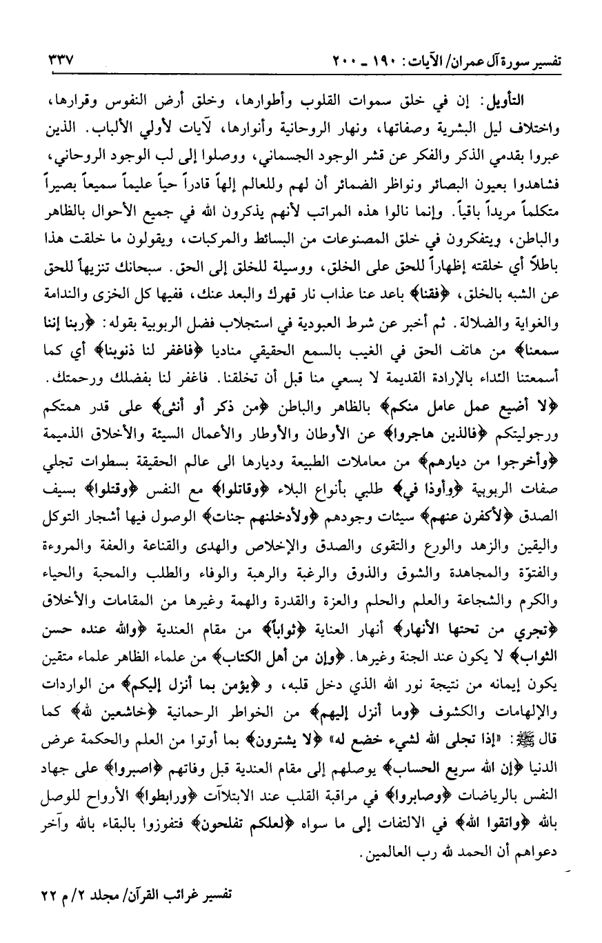 لا أُضِيعُ عَمَلَ عامِلٍ مِنْكُمْ بالظاهر والباطن مِنْ ذَكَرٍ أَوْ أُنْثى على قدر همتكم ورجوليتكم فَالَّذِينَ هاجَرُوا عن الأوطان والأوطار والأعمال السيئة والأخلاق الذميمة وَأُخْرِجُوا مِنْ دِيارِهِمْ من معاملات الطبيعة وديارها الى عالم الحقيقة بسطوات تجلي صفات الربوبية وَأُوذُوا فِي طلبي بأنواع البلاء وَقاتَلُوا مع النفس وَقُتِلُوا بسيف الصدق لَأُكَفِّرَنَّ عَنْهُمْ سيئات وجودهم وَلَأُدْخِلَنَّهُمْ جَنَّاتٍ الوصول فيها أشجار التوكل واليقين والزهد والورع والتقوى والصدق والإخلاص والهدى والقناعة والعفة والمروءة والفتوّة والمجاهدة والشوق والذوق والرغبة والرهبة والوفاء والطلب والمحبة والحياء والكرم والشجاعة والعلم والحلم والعزة والقدرة والهمة وغيرها من المقامات والأخلاق تَجْرِي مِنْ تَحْتِهَا الْأَنْهارُ أنهار العناية ثَواباً من مقام العندية وَاللَّهُ عِنْدَهُ حُسْنُ الثَّوابِ لا يكون عند الجنة وغيرها. وَإِنَّ مِنْ أَهْلِ الْكِتابِ من علماء الظاهر علماء متقين يكون إيمانه من نتيجة نور الله الذي دخل قلبه، ويؤمن بما أنزل إليكم من الواردات والإلهامات والكشوف وَما أُنْزِلَ إِلَيْهِمْ من الخواطر الرحمانية خاشِعِينَ لِلَّهِ كما