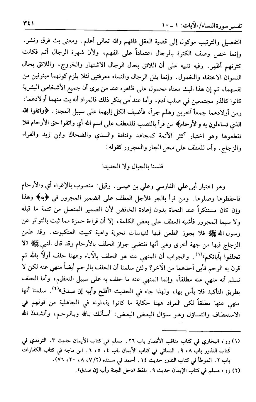 فلسنا بالجبال ولا الحديدا وهو اختيار أبى علي الفارسي وعلي بن عيسى. وقيل: منصوب بالإغراء أي والأرحام فاحفظوها وصلوها. ومن قرأ بالجر فلأجل العطف على الضمير المجرور في بِهِ وهذا وإن كان مستنكرا عند النحاة بدون إعادة الخافض لأن الضمير المتصل من تتمة ما قبله ولا سيما المجرور فأشبه العطف على بعض الكلمة، إلا أن قراءة حمزة مما ثبت بالتواتر عن رسول الله صلى الله عليه وسلم فلا يجوز الطعن فيها لقياسات نحوية واهية كبيت العنكبوت. وقد طعن الزجاج فيها من جهة أخرى وهي أنها تقتضي جواز الحلف بالأرحام