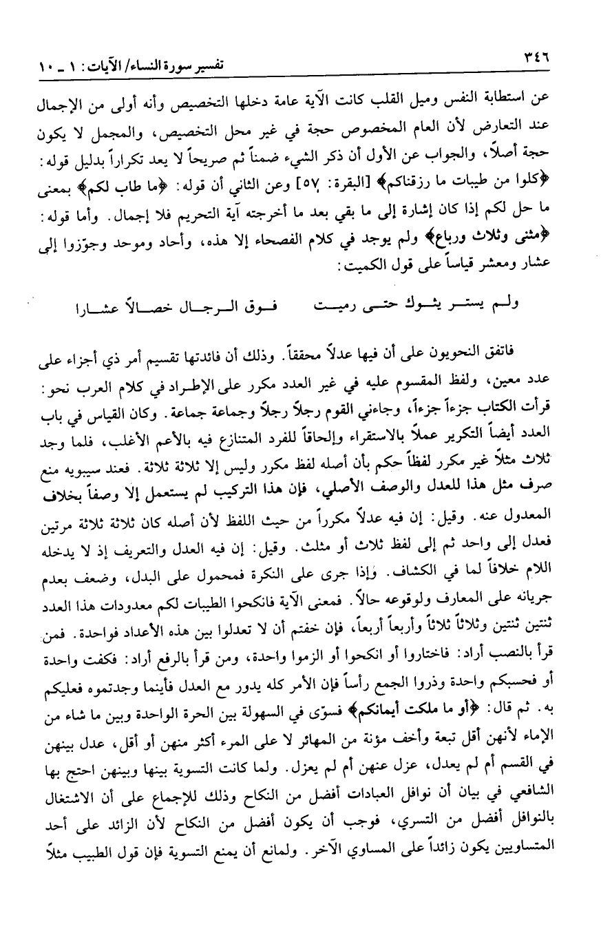 قرأت الكتاب جزءا جزءا، وجاءني القوم رجلا رجلا وجماعة جماعة. وكان القياس في باب العدد أيضا التكرير عملا بالاستقراء وإلحاقا للفرد المتنازع فيه بالأعم الأغلب، فلما وجد ثلاث مثلا غير مكرر لفظا حكم بأن أصله لفظ مكرر وليس إلا ثلاثة ثلاثة. فعند سيبويه منع صرف مثل هذا للعدل والوصف الأصلي، فإن هذا التركيب لم يستعمل إلا وصفا بخلاف المعدول عنه. وقيل: إن فيه عدلا مكررا من حيث اللفظ لأن أصله كان ثلاثة ثلاثة مرتين فعدل إلى واحد ثم إلى لفظ ثلاث أو مثلث. وقيل: إن فيه العدل والتعريف إذ لا يدخله اللام خلافا لما في الكشاف. وإذا جرى على النكرة فمحمول على البدل، وضعف بعدم جريانه على المعارف ولوقوعه حالا. فمعنى الآية فانكحوا الطيبات لكم معدودات هذا العدد ثنتين ثنتين وثلاثا ثلاثا وأربعا أربعا، فإن خفتم أن لا تعدلوا بين هذه الأعداد فواحدة. فمن قرأ بالنصب أراد: فاختاروا أو انكحوا أو الزموا واحدة، ومن قرأ بالرفع أراد: فكفت واحدة أو فحسبكم واحدة وذروا الجمع رأسا فإن الأمر كله يدور مع العدل فأينما وجدتموه فعليكم به. ثم قال: أَوْ ما مَلَكَتْ أَيْمانُكُمْ فسوّى في السهولة بين الحرة الواحدة وبين ما شاء من الإماء لأنهن أقل تبعة وأخف مؤنة من المهائر لا على المرء أكثر منهن أو أقل، عدل بينهن في القسم أم لم يعدل، عزل عنهن أم لم يعزل. ولما كانت التسوية بينها وبينهن احتج بها الشافعي في بيان أن نوافل العبادات أفضل من النكاح وذلك للإجماع على أن الاشتغال بالنوافل أفضل من التسري، فوجب أن يكون أفضل من النكاح لأن الزائد على أحد المتساويين يكون زائدا على المساوي الآخر. ولمانع أن يمنع التسوية فإن قول الطبيب مثلا