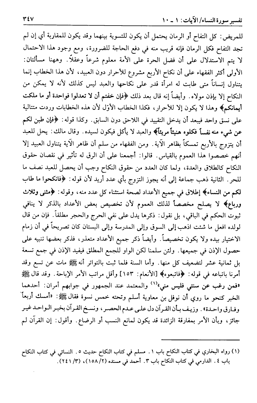 الأولى أكثر الفقهاء على أن نكاح الأربع مشروع للأحرار دون العبيد، لأن هذا الخطاب إنما يتناول إنسانا متى طابت له امرأة قدر على نكاحها والعبد ليس كذلك لأنه لا يمكن من النكاح إلا بإذن مولاه. وأيضا إنه قال بعد ذلك فَإِنْ خِفْتُمْ أَلَّا تَعْدِلُوا فَواحِدَةً أَوْ ما مَلَكَتْ أَيْمانُكُمْ وهذا لا يكون إلا للأحرار، فكذا الخطاب الأوّل لأن هذه الخطابات وردت متتالية على نسق واحد فيبعد أن يدخل التقييد في اللاحق دون السابق. وكذا قوله: فَإِنْ طِبْنَ لَكُمْ عَنْ شَيْءٍ مِنْهُ نَفْساً فَكُلُوهُ هَنِيئاً مَرِيئاً والعبد لا يأكل فيكون لسيده. وقال مالك: يحل للعبد أن يتزوج بالأربع تمسكا بظاهر الآية. ومن الفقهاء من سلم أن ظاهر الآية يتناول العبيد إلا أنهم خصصوا هذا العموم بالقياس. قالوا: أجمعنا على أن الرق له تأثير في نقصان حقوق النكاح كالطلاق والعدة، ولما كان العدد من حقوق النكاح وجب أن يحصل للعبد نصف ما للحر. الثانية ذهب جماعة إلى أنه يجوز التزوج بأي عدد أريد لأن قوله: فَانْكِحُوا ما طابَ لَكُمْ مِنَ النِّساءِ إطلاق في جميع الأعداد لصحة استثناء كل عدد منه، وقوله: مَثْنى وَثُلاثَ وَرُباعَ لا يصلح مخصصا لذلك العموم لأن تخصيص بعض الأعداد بالذكر لا ينافي ثبوت الحكم في الباقي، بل نقول: ذكرها يدل على نفي الحرج والحجر مطلقا. فإن من قال لولده افعل ما شئت اذهب إلى السوق وإلى المدرسة وإلى البستان كان تصريحا في أن زمام الاختيار بيده ولا يكون تخصيصا. وأيضا ذكر جميع الأعداد متعذر، فذكر بعضها تنبيه على حصول الإذن في جميعها. ولئن سلمنا لكن الواو للجمع المطلق فيفيد الإذن في جمع تسعة بل ثمانية عشر لتضعيف كل منها. وأما السنة فلما ثبت بالتواتر أنه صلى الله عليه وسلم مات عن تسع وقد أمرنا باتباعه في قوله: فَاتَّبِعُوهُ [الأنعام: 153] وأقل مراتب الأمر الإباحة.