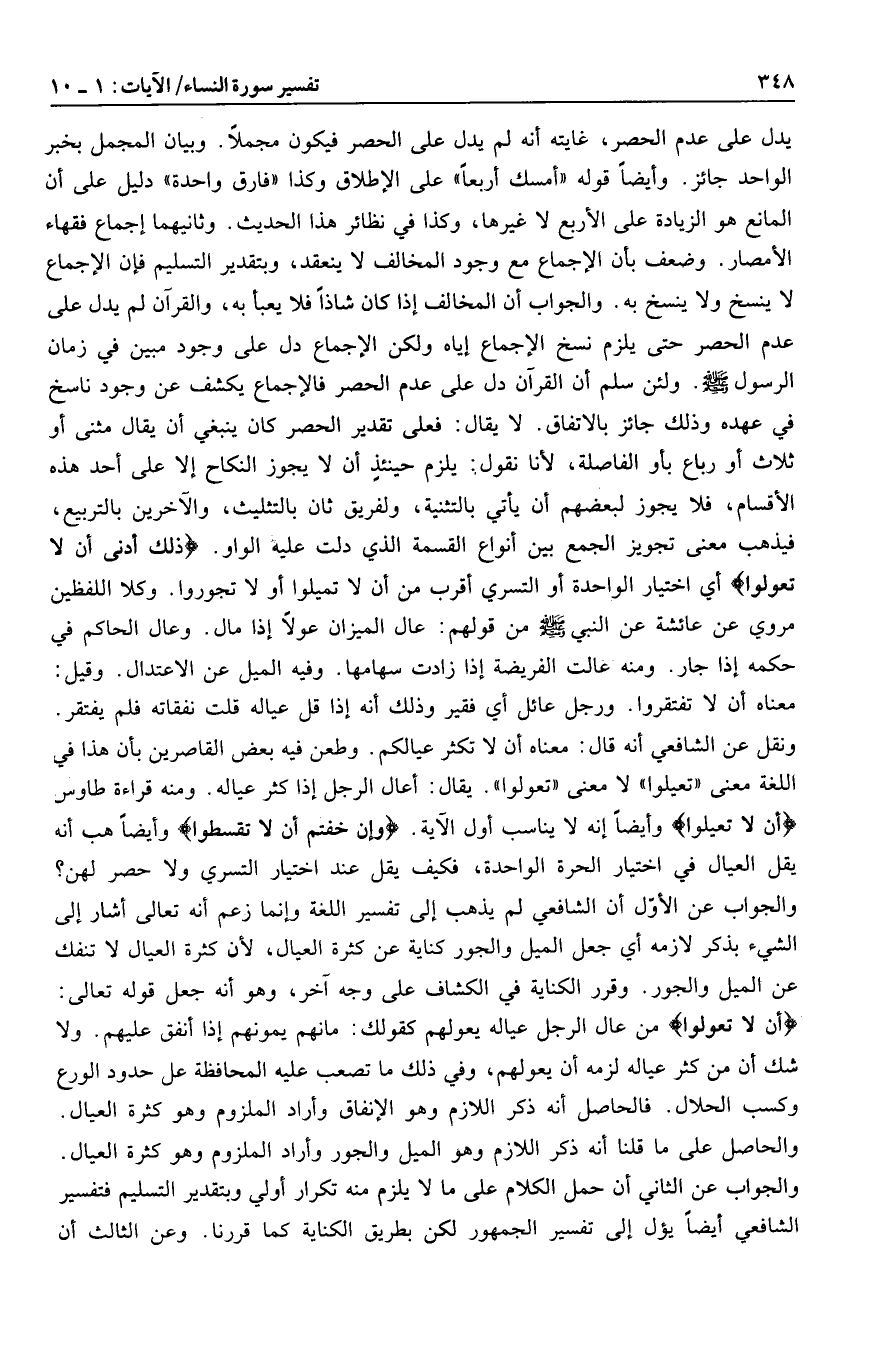 ونقل عن الشافعي أنه قال: معناه أن لا تكثر عيالكم. وطعن فيه بعض القاصرين بأن هذا في اللغة معنى «تعيلوا» لا معنى «تعولوا» . يقال: أعال الرجل إذا كثر عياله. ومنه قراءة طاوس أن لا تعيلوا وأيضا إنه لا يناسب أول الآية. وَإِنْ خِفْتُمْ أَلَّا تُقْسِطُوا وأيضا هب أنه يقل العيال في اختيار الحرة الواحدة، فكيف يقل عند اختيار التسري ولا حصر لهن؟