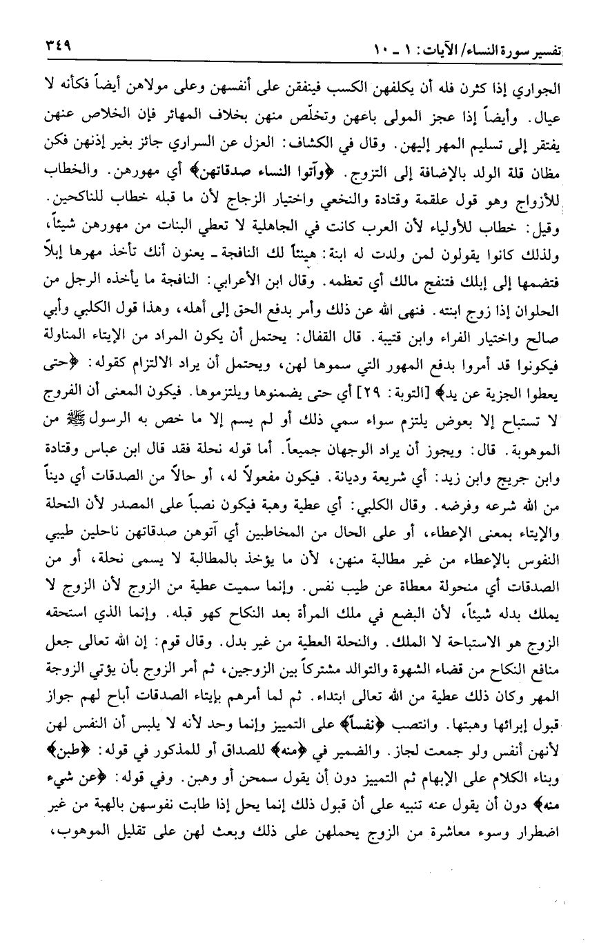 وقيل: خطاب للأولياء لأن العرب كانت في الجاهلية لا تعطي البنات من مهورهن شيئا، ولذلك كانوا يقولون لمن ولدت له ابنة: هينئا لك النافجة- يعنون أنك تأخذ مهرها إبلا فتضمها إلى إبلك فتنفج مالك أي تعظمه. وقال ابن الأعرابي: النافجة ما يأخذه الرجل من الحلوان إذا زوج ابنته. فنهى الله عن ذلك وأمر بدفع الحق إلى أهله، وهذا قول الكلبي وأبي صالح واختيار الفراء وابن قتيبة. قال القفال: يحتمل أن يكون المراد من الإيتاء المناولة فيكونوا قد أمروا بدفع المهور التي سموها لهن، ويحتمل أن يراد الالتزام كقوله: حَتَّى يُعْطُوا الْجِزْيَةَ عَنْ يَدٍ [التوبة: 29] أي حتى يضمنوها ويلتزموها. فيكون المعنى أن الفروج لا تستباح إلا بعوض يلتزم سواء سمي ذلك أو لم يسم إلا ما خص به الرسول صلى الله عليه وسلم من الموهوبة. قال: ويجوز أن يراد الوجهان جميعا. أما قوله نحلة فقد قال ابن عباس وقتادة وابن جريج وابن زيد: أي شريعة وديانة. فيكون مفعولا له، أو حالا من الصدقات أي دينا من الله شرعه وفرضه. وقال الكلبي: أي عطية وهبة فيكون نصبا على المصدر لأن النحلة والإيتاء بمعنى الإعطاء، أو على الحال من المخاطبين أي آتوهن صدقاتهن ناحلين طيبي النفوس بالإعطاء من غير مطالبة منهن، لأن ما يؤخذ بالمطالبة لا يسمى نحلة، أو من الصدقات أي منحولة معطاة عن طيب نفس. وإنما سميت عطية من الزوج لأن الزوج لا يملك بدله شيئا، لأن البضع في ملك المرأة بعد النكاح كهو قبله. وإنما الذي استحقه الزوج هو الاستباحة لا الملك. والنحلة العطية من غير بدل. وقال قوم: إن الله تعالى جعل منافع النكاح من قضاء الشهوة والتوالد مشتركا بين الزوجين، ثم أمر الزوج بأن يؤتي الزوجة المهر وكان ذلك عطية من الله تعالى ابتداء. ثم لما أمرهم بإيتاء الصدقات أباح لهم جواز قبول إبرائها وهبتها. وانتصب نَفْساً على التمييز وإنما وحد لأنه لا يلبس أن النفس لهن لأنهن أنفس ولو جمعت لجاز. والضمير في مِنْهُ للصداق أو للمذكور في قوله: طِبْنَ وبناء الكلام على الإبهام ثم التمييز دون أن يقول سمحن أو وهبن. وفي قوله: عَنْ شَيْءٍ مِنْهُ دون أن يقول عنه تنبيه على أن قبول ذلك إنما يحل إذا طابت نفوسهن بالهبة من غير اضطرار وسوء معاشرة من الزوج يحملهن على ذلك وبعث لهن على تقليل الموهوب،