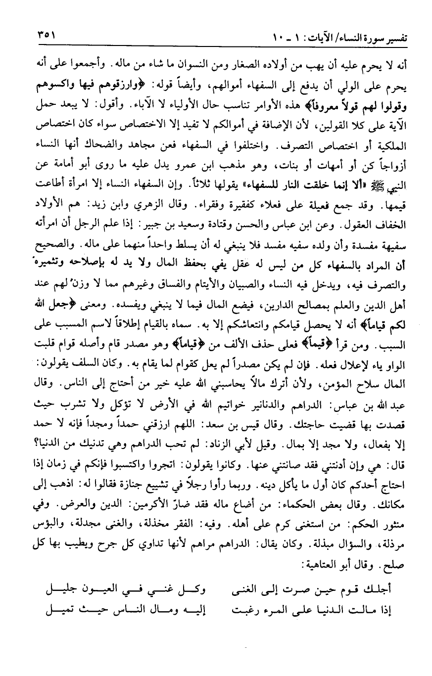 وإن السفهاء النساء إلا امرأة أطاعت قيمها. وقد جمع فعلية على فعلاء كفقيرة وفقراء. وقال الزهري وابن زيد: هم الأولاد الخفاف العقول. وعن ابن عباس والحسن وقتادة وسعيد بن جبير: إذا علم الرجل أن امرأته سفيهة مفسدة وأن ولده سفيه مفسد فلا ينبغي له أن يسلط واحدا منهما على ماله. والصحيح أن المراد بالسفهاء كل من ليس له عقل يفي بحفظ المال ولا يد له بإصلاحه وتثميره والتصرف فيه، ويدخل فيه النساء والصبيان والأيتام والفساق وغيرهم مما لا وزن لهم عند أهل الدين والعلم بمصالح الدارين، فيضع المال فيما لا ينبغي ويفسده. ومعنى جَعَلَ اللَّهُ لَكُمْ قِياماً أنه لا يحصل قيامكم وانتعاشكم إلا به. سماه بالقيام إطلاقا لاسم المسبب على السبب. ومن قرأ قيما فعلى حذف الألف من قِياماً وهو مصدر قام وأصله قوام قلبت الواو ياء لإعلال فعله. فإن لم يكن مصدرا لم يعل كقوام لما يقام به. وكان السلف يقولون: