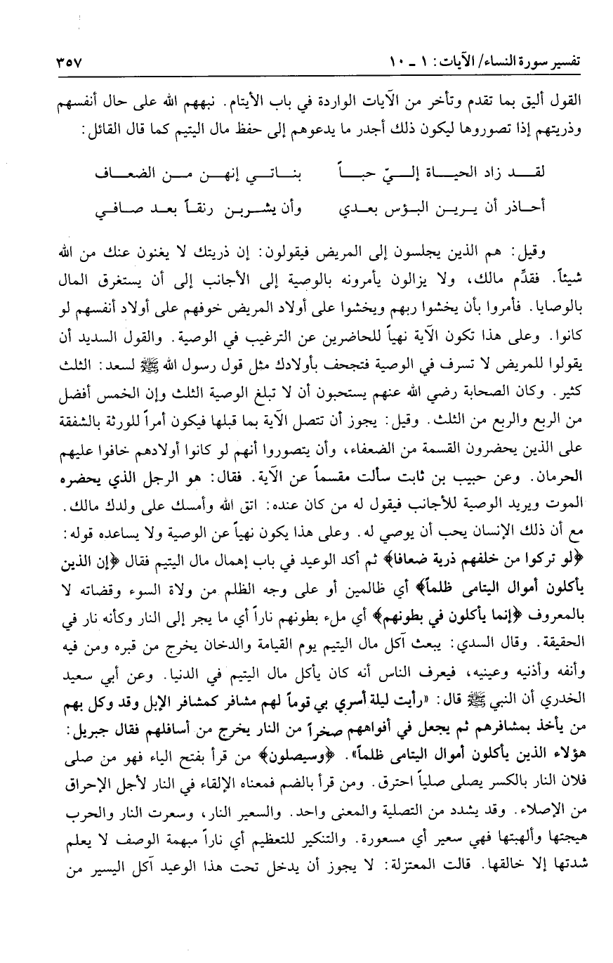 لَوْ تَرَكُوا مِنْ خَلْفِهِمْ ذُرِّيَّةً ضِعافاً ثم أكد الوعيد في باب إهمال مال اليتيم فقال إِنَّ الَّذِينَ يَأْكُلُونَ أَمْوالَ الْيَتامى ظُلْماً أي ظالمين أو على وجه الظلم من ولاة السوء وقضاته لا بالمعروف إِنَّما يَأْكُلُونَ فِي بُطُونِهِمْ أي ملء بطونهم نارا أي ما يجر إلى النار وكأنه نار في الحقيقة. وقال السدي: يبعث آكل مال اليتيم يوم القيامة والدخان يخرج من قبره ومن فيه وأنفه وأذنيه وعينيه، فيعرف الناس أنه كان يأكل مال اليتيم في الدنيا.