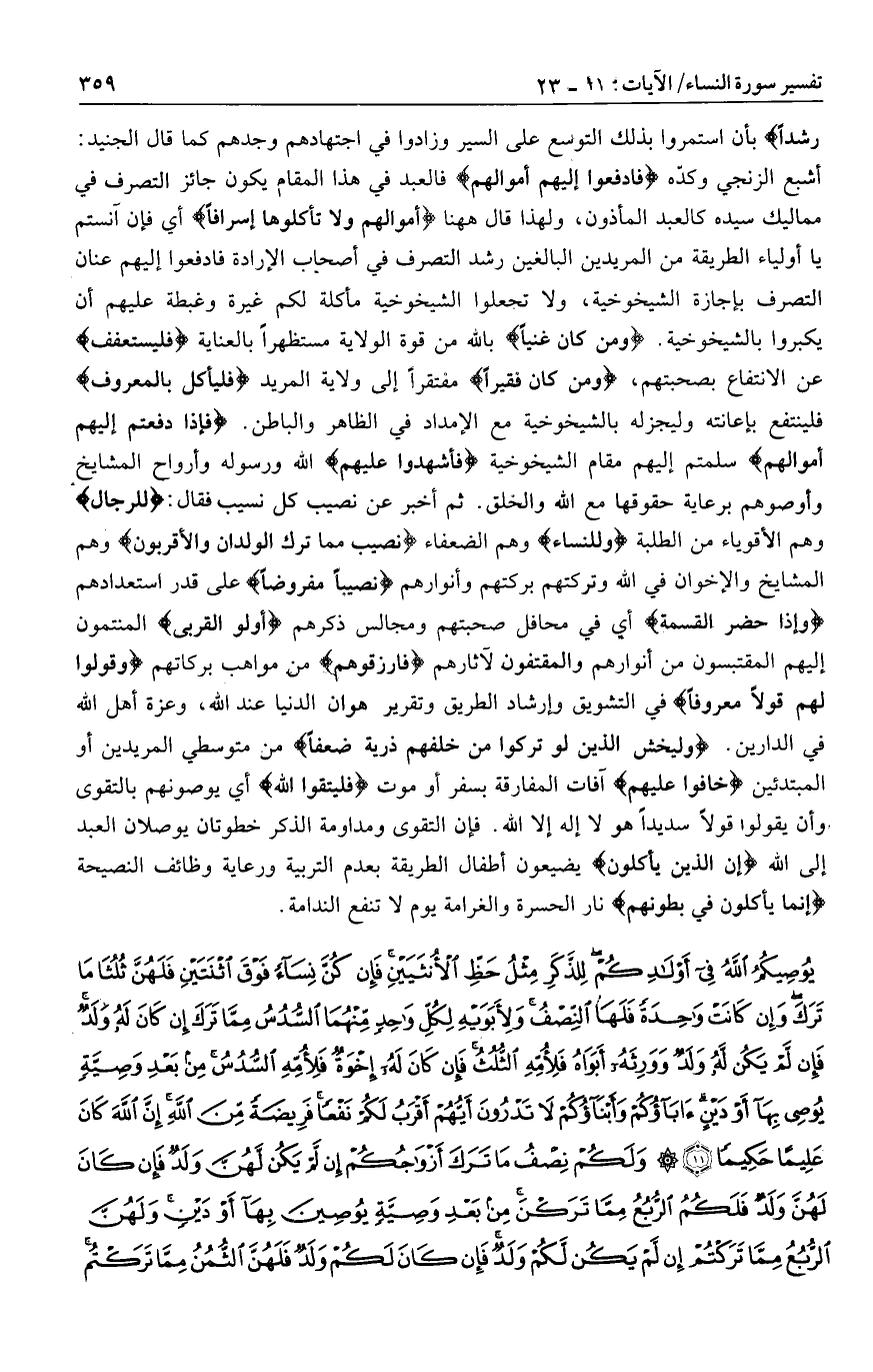 أشبع الزنجي وكدّه فَادْفَعُوا إِلَيْهِمْ أَمْوالَهُمْ فالعبد في هذا المقام يكون جائز التصرف في مماليك سيده كالعبد المأذون، ولهذا قال هاهنا أَمْوالَهُمْ وَلا تَأْكُلُوها إِسْرافاً أي فإن آنستم يا أولياء الطريقة من المريدين البالغين رشد التصرف في أصحاب الإرادة فادفعوا إليهم عنان التصرف بإجازة الشيخوخية، ولا تجعلوا الشيخوخية مأكلة لكم غيرة وغبطة عليهم أن يكبروا بالشيخوخية. وَمَنْ كانَ غَنِيًّا بالله من قوة الولاية مستظهرا بالعناية فَلْيَسْتَعْفِفْ عن الانتفاع بصحبتهم، وَمَنْ كانَ فَقِيراً مفتقرا إلى ولاية المريد فَلْيَأْكُلْ بِالْمَعْرُوفِ فلينتفع بإعانته وليجزله بالشيخوخية مع الإمداد في الظاهر والباطن. فَإِذا دَفَعْتُمْ إِلَيْهِمْ أَمْوالَهُمْ سلمتم إليهم مقام الشيخوخية فَأَشْهِدُوا عَلَيْهِمْ الله ورسوله وأرواح المشايخ وأوصوهم برعاية حقوقها مع الله والخلق. ثم أخبر عن نصيب كل نسيب فقال: لِلرِّجالِ وهم الأقوياء من الطلبة وَلِلنِّساءِ وهم الضعفاء نَصِيبٌ مِمَّا تَرَكَ الْوالِدانِ وَالْأَقْرَبُونَ وهم المشايخ والإخوان في الله وتركتهم بركتهم وأنوارهم نَصِيباً مَفْرُوضاً على قدر استعدادهم وَإِذا حَضَرَ الْقِسْمَةَ أي في محافل صحبتهم ومجالس ذكرهم أُولُوا الْقُرْبى المنتمون إليهم المقتبسون من أنوارهم والمقتفون لآثارهم فَارْزُقُوهُمْ من مواهب بركاتهم وَقُولُوا لَهُمْ قَوْلًا مَعْرُوفاً في التشويق وإرشاد الطريق وتقرير هوان الدنيا عند الله، وعزة أهل الله في الدارين. وَلْيَخْشَ الَّذِينَ لَوْ تَرَكُوا مِنْ خَلْفِهِمْ ذُرِّيَّةً ضِعافاً من متوسطي المريدين أو المبتدئين خافُوا عَلَيْهِمْ آفات المفارقة بسفر أو موت فَلْيَتَّقُوا اللَّهَ أي يوصونهم بالتقوى وأن يقولوا قولا سديدا هو لا إله إلا الله. فإن التقوى ومداومة الذكر خطوتان يوصلان العبد إلى الله إِنَّ الَّذِينَ يَأْكُلُونَ يضيعون أطفال الطريقة بعدم التربية ورعاية وظائف النصيحة إِنَّما يَأْكُلُونَ فِي بُطُونِهِمْ نار الحسرة والغرامة يوم لا تنفع الندامة.