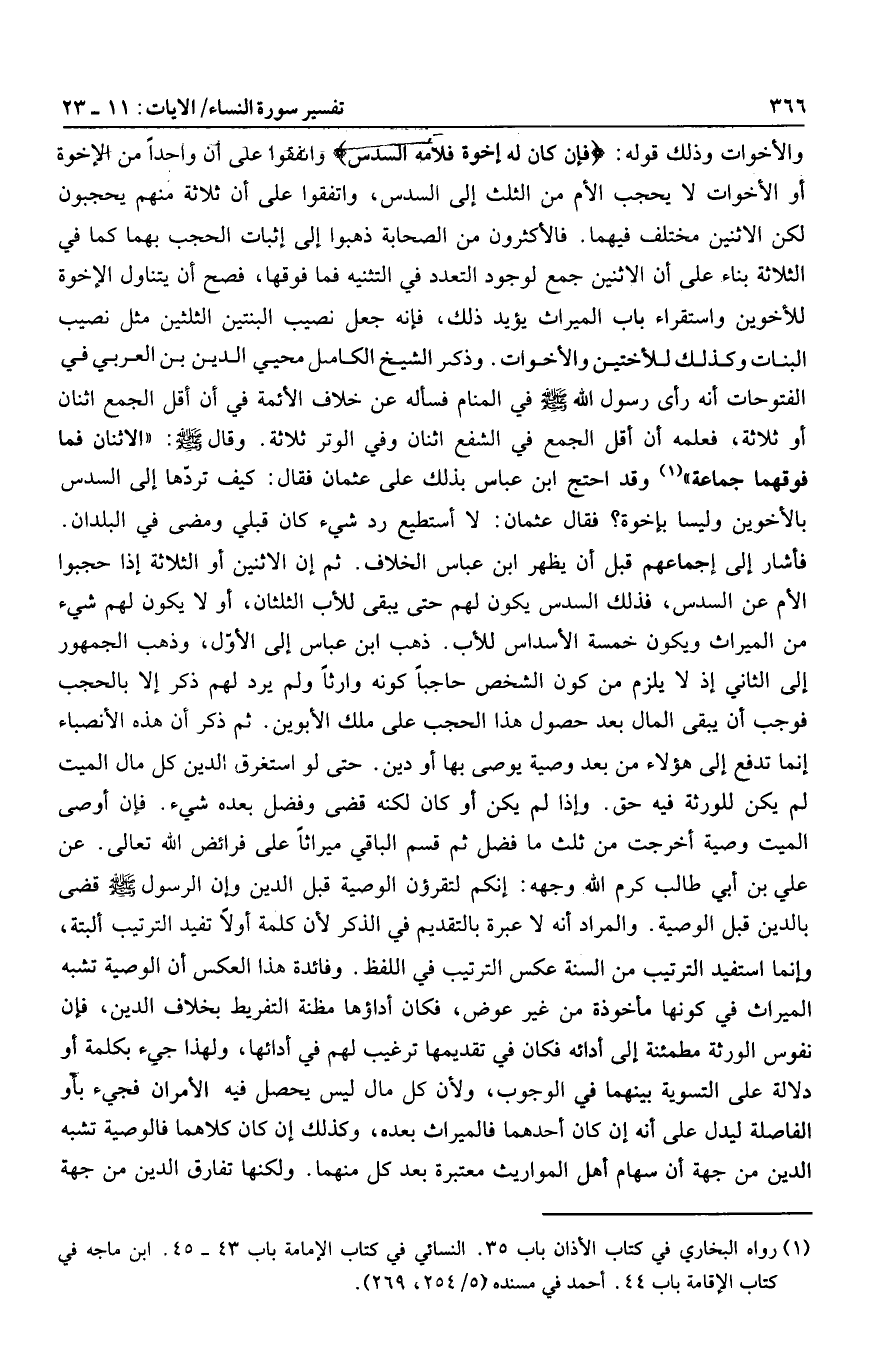 والأخوات وذلك قوله: فَإِنْ كانَ لَهُ إِخْوَةٌ فَلِأُمِّهِ السُّدُسُ واتفقوا على أن واحدا من الإخوة أو الأخوات لا يحجب الأم من الثلث إلى السدس، واتفقوا على أن ثلاثة منهم يحجبون لكن الاثنين مختلف فيهما. فالأكثرون من الصحابة ذهبوا إلى إثبات الحجب بهما كما في الثلاثة بناء على أن الاثنين جمع لوجود التعدد في التثنية فما فوقها، فصح أن يتناول الإخوة للأخوين واستقراء باب الميراث يؤيد ذلك، فإنه جعل نصيب البنتين الثلثين مثل نصيب البنات وكذلك للأختين والأخوات. وذكر الشيخ الكامل محيي الدين بن العربي في الفتوحات أنه رأى رسول الله صلى الله عليه وسلم في المنام فسأله عن خلاف الأئمة في أن أقل الجمع اثنان أو ثلاثة، فعلمه أن أقل الجمع في الشفع اثنان وفي الوتر ثلاثة.