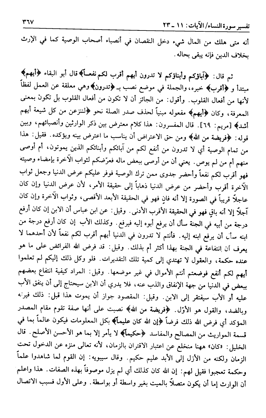 ثم قال: آباؤُكُمْ وَأَبْناؤُكُمْ لا تَدْرُونَ أَيُّهُمْ أَقْرَبُ لَكُمْ نَفْعاً قال أبو البقاء أَيُّهُمْ مبتدأ وأَقْرَبُ خبره، والجملة في موضع نصب ب تَدْرُونَ وهي معلقة عن العمل لفظا لأنها من أفعال القلوب. وأقول: من الجائز أن لا تكون من أفعال القلوب بل تكون بمعنى المعرفة، وكان أَيُّهُمْ مفعوله مبنيا لحذف صدر الصلة نحو لَنَنْزِعَنَّ مِنْ كُلِّ شِيعَةٍ أَيُّهُمْ أَشَدُّ [مريم: 69] . قال المفسرون: هذا كلام معترض بين ذكر الوارثين وأنصبائهم، وبين قوله: فَرِيضَةً مِنَ اللَّهِ ومن حق الاعتراض أن يناسب ما اعترض بينه ويؤكده. فقيل: هذا من تمام الوصية أي لا تدرون من أنفع لكم من آبائكم وأبنائكم الذين يموتون، أم أوصى منهم أم من لم يوص. يعني أن من أوصى ببعض ماله فعرّضكم لثواب الآخرة بإمضاء وصيته فهو أقرب لكم نفعا وأحضر جدوى ممن ترك الوصية فوفر عليكم عرض الدنيا وجعل ثواب الآخرة أقرب وأحضر من عرض الدنيا ذهابا إلى حقيقة الأمر، لأن عرض الدنيا وإن كان عاجلا قريبا في الصورة إلا أنه فان فهو في الحقيقة الأبعد الأقصى، وثواب الآخرة وإن كان آجلا إلا أنه باق فهو في الحقيقة الأقرب الأدنى. وقيل: عن ابن عباس أن الابن إن كان أرفع درجة من أبيه في الجنة سأل أن يرفع أبوه إليه فيرفع. وكذلك الأب إن كان أرفع درجة من ابنه سأل أن يرفع ابنه إليه. فأنتم لا تدرون في الدنيا أيهم أقرب لكم نفعا لأن أحدهما لا يعرف ان انتفاعه في الجنة بهذا أكثر أم بذلك. وقيل: قد فرض الله الفرائض على ما هو عنده حكمة، والعقول لا تهتدي إلى كمية تلك التقديرات. فلو وكل ذلك إليكم لم تعلموا أيهم لكم أنفع فوضعتم أنتم الأموال في غير موضعها. وقيل: المراد كيفية انتفاع بعضهم ببعض في الدنيا من جهة الإنفاق والذب عنه، فلا يدري أن الابن سيحتاج إلى أن ينفق الأب عليه أو الأب سيفتقر إلى الابن. وقيل: المقصود جواز أن يموت هذا قبل: ذلك فيرنه وبالضد، والقول هو الأوّل. فَرِيضَةً مِنَ اللَّهِ نصبت على أنها صفة تقوم مقام المصدر المؤكد أي فرض الله ذلك فرضا إِنَّ اللَّهَ كانَ عَلِيماً بكل المعلومات فيكون عالما بما في قسمة المواريث من المصالح والمفاسد حَكِيماً لا يأمر إلا بما هو الأحسن الأصلح. قال الخليل: «كان» هاهنا منخلع عن اعتبار الاقتران بالزمان، لأنه تعالى منزه عن الدخول تحت الزمان ولكنه من الأزل إلى الأبد عليم حكيم. وقال سيبويه: إن القوم لما شاهدوا علما وحكمة تعجبوا فقيل لهم: إن الله كان كذلك أي لم يزل موصوفا بهذه الصفات. هذا واعلم أن الوارث إما أن يكون متصلا بالميت بغير واسطة أو بواسطة. وعلى الأول فسبب الاتصال
