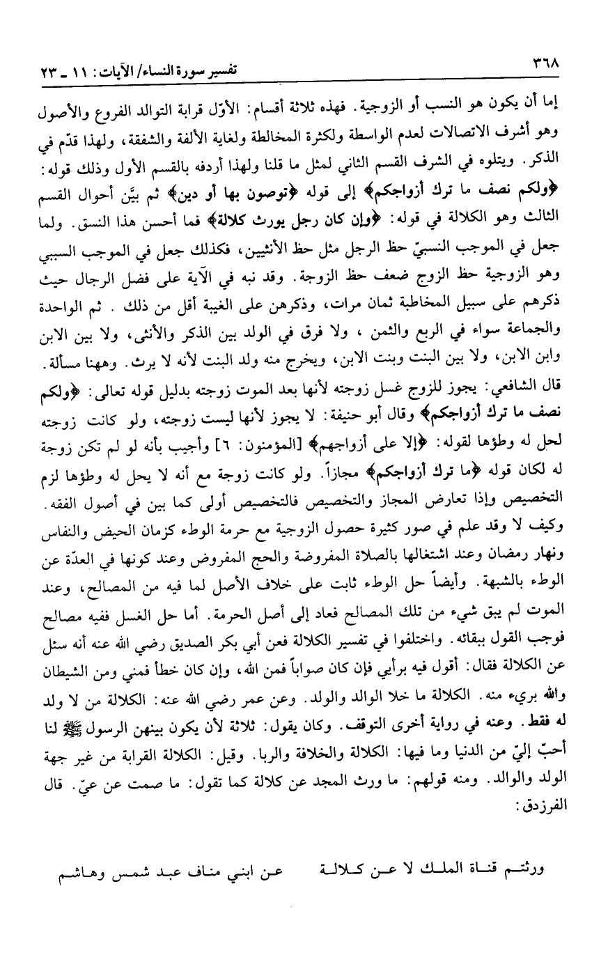 وكيف لا وقد علم في صور كثيرة حصول الزوجية مع حرمة الوطء كزمان الحيض والنفاس ونهار رمضان وعند اشتغالها بالصلاة المفروضة والحج المفروض وعند كونها في العدّة عن الوطء بالشبهة. وأيضا حل الوطء ثابت على خلاف الأصل لما فيه من المصالح، وعند الموت لم يبق شيء من تلك المصالح فعاد إلى أصل الحرمة. أما حل الغسل ففيه مصالح فوجب القول ببقائه. واختلفوا في تفسير الكلالة فعن أبي بكر الصديق رضي الله عنه أنه سئل عن الكلالة فقال: أقول فيه برأيي فإن كان صوابا فمن الله، وإن كان خطأ فمني ومن الشيطان والله بريء منه. الكلالة ما خلا الوالد والولد. وعن عمر رضي الله عنه: الكلالة من لا ولد له فقط. وعنه في رواية أخرى التوقف. وكان يقول: ثلاثة لأن يكون بينهن الرسول صلى الله عليه وسلم لنا أحبّ إليّ من الدنيا وما فيها: الكلالة والخلافة والربا. وقيل: الكلالة القرابة من غير جهة الولد والوالد. ومنه قولهم: ما ورث المجد عن كلالة كما تقول: ما صمت عن عيّ. قال الفرزدق: