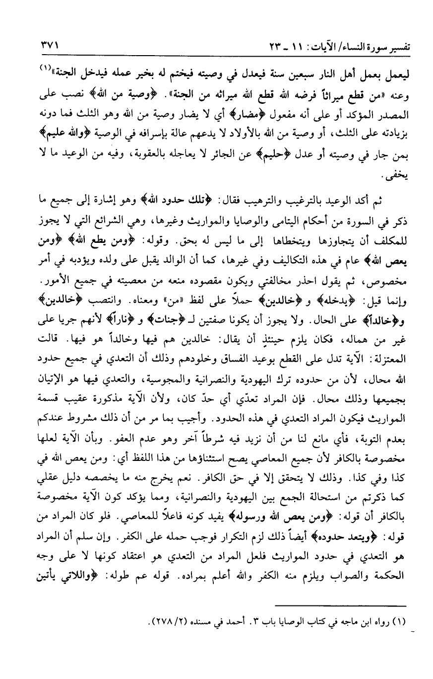 وإنما قيل: يُدْخِلْهُ وخالِدِينَ حملا على لفظ «من» ومعناه. وانتصب خالِدِينَ وخالِداً على الحال. ولا يجوز أن يكونا صفتين ل جَنَّاتٍ وناراً لأنهم جريا على غير من هماله، فكان يلزم حينئذ أن يقال: خالدين هم فيها وخالدا هو فيها. قالت المعتزلة: الآية تدل على القطع بوعيد الفساق وخلودهم وذلك أن التعدي في جميع حدود الله محال، لأن من حدوده ترك اليهودية والنصرانية والمجوسية، والتعدي فيها هو الإتيان بجميعها وذلك محال. فإن المراد تعدّي أي حدّ كان، ولأن الآية مذكورة عقيب قسمة المواريث فيكون المراد التعدي في هذه الحدود. وأجيب بما مر من أن ذلك مشروط عندكم بعدم التوبة، فأي مانع لنا من أن نزيد فيه شرطا آخر وهو عدم العفو. وبأن الآية لعلها مخصوصة بالكافر لأن جميع المعاصي يصح استثناؤها من هذا اللفظ أي: ومن يعص الله في كذا وفي كذا. وذلك لا يتحقق إلا في حق الكافر. نعم يخرج منه ما يخصصه دليل عقلي كما ذكرتم من استحالة الجمع بين اليهودية والنصرانية، ومما يؤكد كون الآية مخصوصة بالكافر أن قوله: وَمَنْ يَعْصِ اللَّهَ وَرَسُولَهُ يفيد كونه فاعلا للمعاصي. فلو كان المراد من قوله: وَيَتَعَدَّ حُدُودَهُ أيضا ذلك لزم التكرار فوجب حمله على الكفر. وإن سلم أن المراد هو التعدي في حدود المواريث فلعل المراد من التعدي هو اعتقاد كونها لا على وجه الحكمة والصواب ويلزم منه الكفر والله أعلم بمراده. قوله عم طوله: وَاللَّاتِي يَأْتِينَ الْفاحِشَةَ الآية.