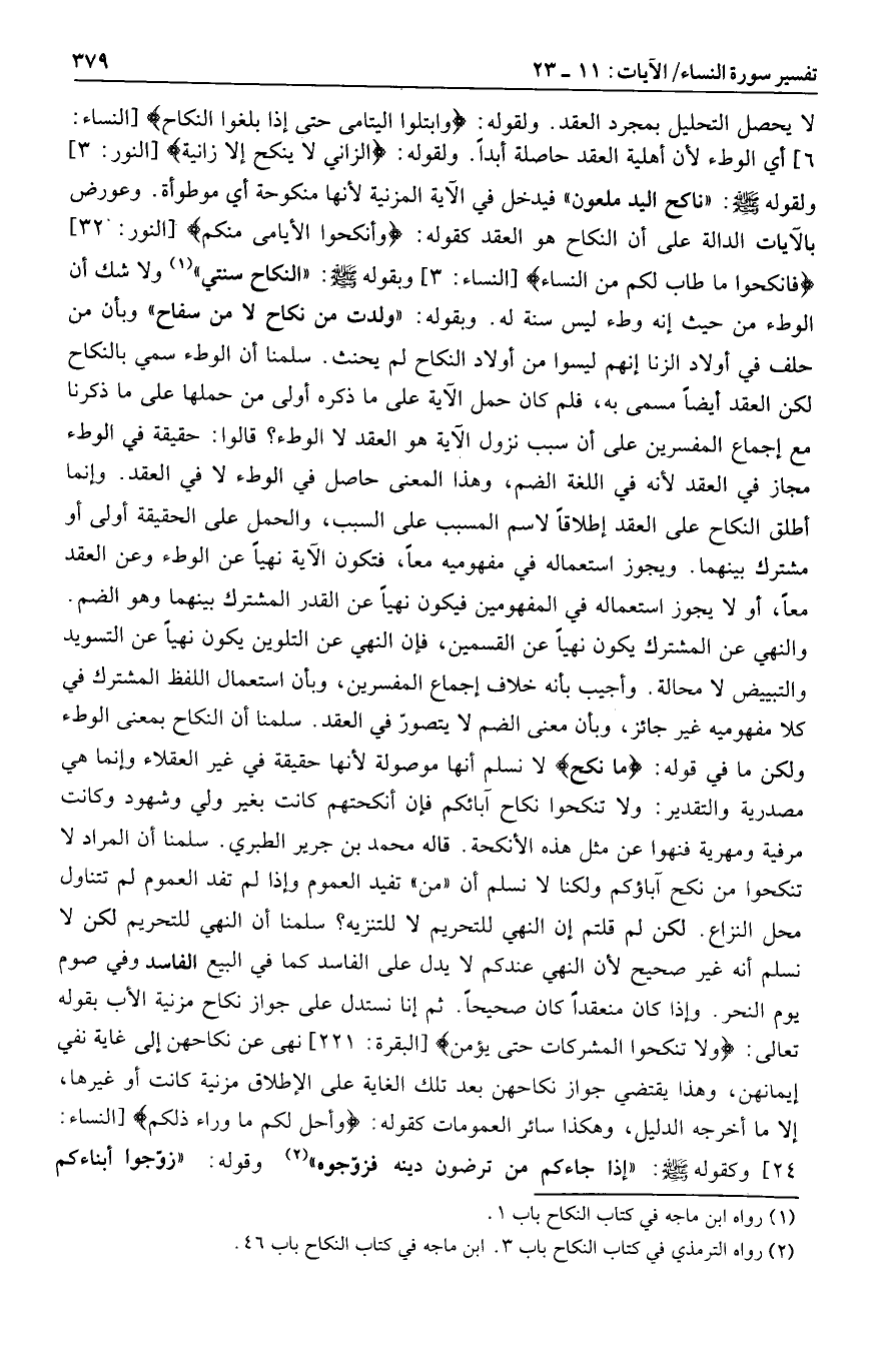 والنهي عن المشترك يكون نهيا عن القسمين، فإن النهي عن التلوين يكون نهيا عن التسويد والتبييض لا محالة. وأجيب بأنه خلاف إجماع المفسرين، وبأن استعمال اللفظ المشترك في كلا مفهوميه غير جائز، وبأن معنى الضم لا يتصورّ في العقد. سلمنا أن النكاح بمعنى الوطء ولكن ما في قوله: ما نَكَحَ لا نسلم أنها موصولة لأنها حقيقة في غير العقلاء وإنما هي مصدرية والتقدير: ولا تنكحوا نكاح آبائكم فإن أنكحتهم كانت بغير ولي وشهود وكانت مرفية ومهرية فنهوا عن مثل هذه الأنكحة. قاله محمد بن جرير الطبري. سلمنا أن المراد لا تنكحوا من نكح آباؤكم ولكنا لا نسلم أن «من» تفيد العموم وإذا لم تفد العموم لم تتناول محل النزاع. لكن لم قلتم إن النهي للتحريم لا للتنزيه؟ سلمنا أن النهي للتحريم لكن لا نسلم أنه غير صحيح لأن النهي عندكم لا يدل على الفاسد كما في البيع الفاسد وفي صوم يوم النحر. وإذا كان منعقدا كان صحيحا. ثم إنا نستدل على جواز نكاح مزنية الأب بقوله تعالى: وَلا تَنْكِحُوا الْمُشْرِكاتِ حَتَّى يُؤْمِنَّ [البقرة: 221] نهى عن نكاحهن إلى غاية نفي إيمانهن، وهذا يقتضي جواز نكاحهن بعد تلك الغاية على الإطلاق مزنية كانت أو غيرها، إلا ما أخرجه الدليل، وهكذا سائر العمومات كقوله: وَأُحِلَّ لَكُمْ ما وَراءَ ذلِكُمْ [النساء: