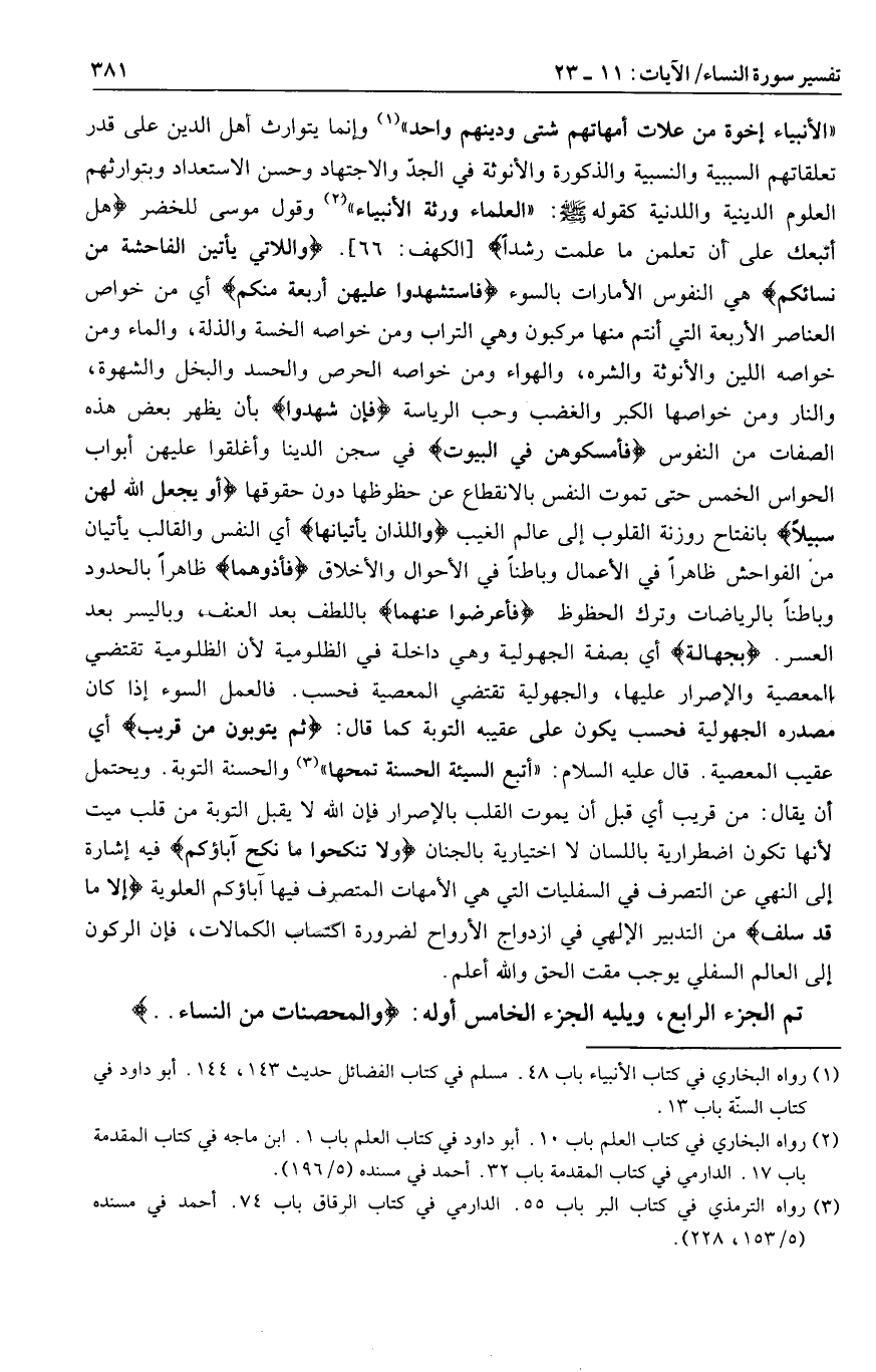 وقول موسى للخضر هَلْ أَتَّبِعُكَ عَلى أَنْ تُعَلِّمَنِ مِمَّا عُلِّمْتَ رُشْداً [الكهف: 66] . وَاللَّاتِي يَأْتِينَ الْفاحِشَةَ مِنْ نِسائِكُمْ هي النفوس الأمارات بالسوء فَاسْتَشْهِدُوا عَلَيْهِنَّ أَرْبَعَةً مِنْكُمْ أي من خواص العناصر الأربعة التي أنتم منها مركبون وهي التراب ومن خواصه الخسة والذلة، والماء ومن خواصه اللين والأنوثة والشره، والهواء ومن خواصه الحرص والحسد والبخل والشهوة، والنار ومن خواصها الكبر والغضب وحب الرياسة فَإِنْ شَهِدُوا بأن يظهر بعض هذه الصفات من النفوس فَأَمْسِكُوهُنَّ فِي الْبُيُوتِ في سجن الدينا وأغلقوا عليهن أبواب الحواس الخمس حتى تموت النفس بالانقطاع عن حظوظها دون حقوقها أَوْ يَجْعَلَ اللَّهُ لَهُنَّ سَبِيلًا بانفتاح روزنة القلوب إلى عالم الغيب وَالَّذانِ يَأْتِيانِها أي النفس والقالب يأتيان من الفواحش ظاهرا في الأعمال وباطنا في الأحوال والأخلاق فَآذُوهُما ظاهرا بالحدود وباطنا بالرياضات وترك الحظوظ فَأَعْرِضُوا عَنْهُما باللطف بعد العنف، وباليسر بعد العسر. بِجَهالَةٍ أي بصفة الجهولية وهي داخلة في الظلومية لأن الظلومية تقتضي المعصية والإصرار عليها، والجهولية تقتضي المعصية فحسب. فالعمل السوء إذا كان مصدره الجهولية فحسب يكون على عقيبه التوبة كما قال: ثُمَّ يَتُوبُونَ مِنْ قَرِيبٍ أي عقيب المعصية.