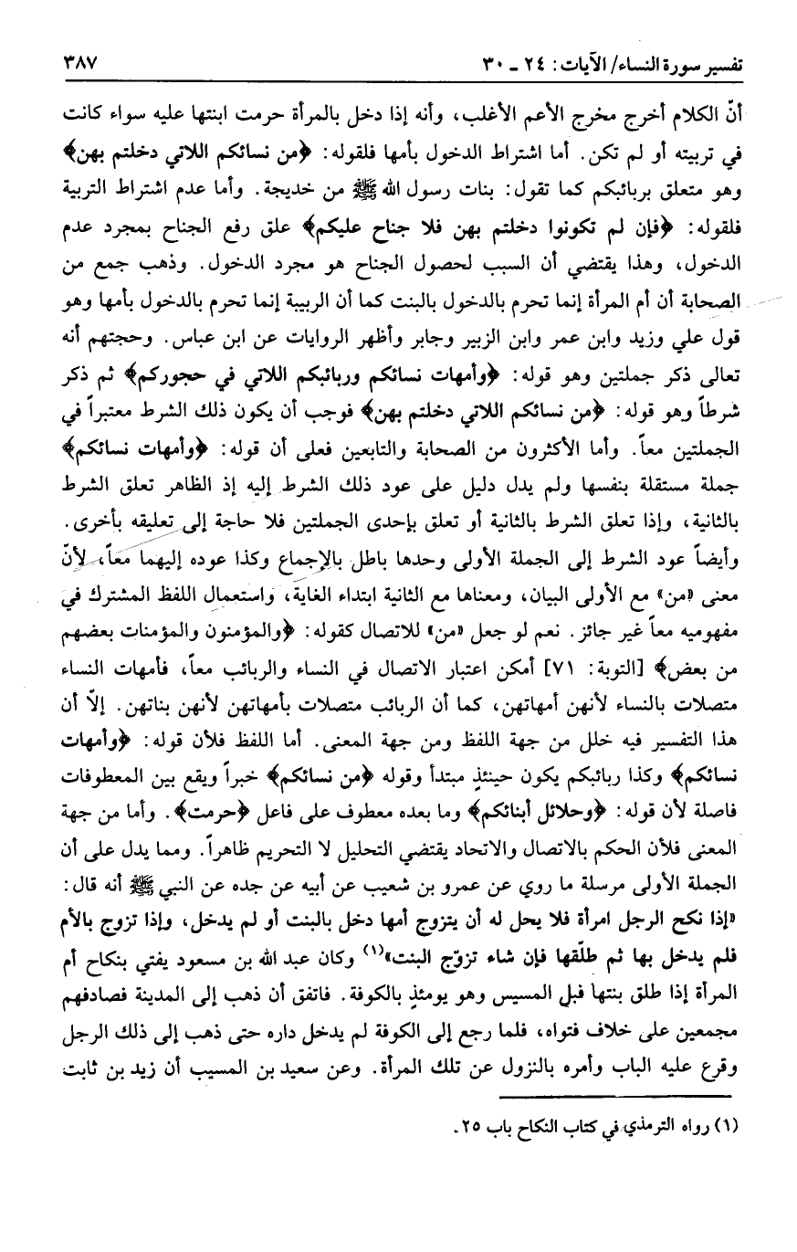 أنّ الكلام أخرج مخرج الأعم الأغلب، وأنه إذا دخل بالمرأة حرمت ابنتها عليه سواء كانت في تربيته أو لم تكن. أما اشتراط الدخول بأمها فلقوله: مِنْ نِسائِكُمُ اللَّاتِي دَخَلْتُمْ بِهِنَّ وهو متعلق بربائبكم كما تقول: بنات رسول الله صلى الله عليه وسلم من خديجة. وأما عدم اشتراط التربية فلقوله: فَإِنْ لَمْ تَكُونُوا دَخَلْتُمْ بِهِنَّ فَلا جُناحَ عَلَيْكُمْ علق رفع الجناح بمجرد عدم الدخول، وهذا يقتضي أن السبب لحصول الجناح هو مجرد الدخول. وذهب جمع من الصحابة أن أم المرأة إنما تحرم بالدخول بالبنت كما أن الربيبة إنما تحرم بالدخول بأمها وهو قول علي وزيد وابن عمر وابن الزبير وجابر وأظهر الروايات عن ابن عباس. وحجتهم أنه تعالى ذكر جملتين وهو قوله: وَأُمَّهاتُ نِسائِكُمْ وَرَبائِبُكُمُ اللَّاتِي فِي حُجُورِكُمْ ثم ذكر شرطا وهو قوله: مِنْ نِسائِكُمُ اللَّاتِي دَخَلْتُمْ بِهِنَّ فوجب أن يكون ذلك الشرط معتبرا في الجملتين معا. وأما الأكثرون من الصحابة والتابعين فعلى أن قوله: وَأُمَّهاتُ نِسائِكُمْ جملة مستقلة بنفسها ولم يدل دليل على عود ذلك الشرط إليه إذ الظاهر تعلق الشرط بالثانية، وإذا تعلق الشرط بالثانية أو تعلق بإحدى الجملتين فلا حاجة إلى تعليقه بأخرى.