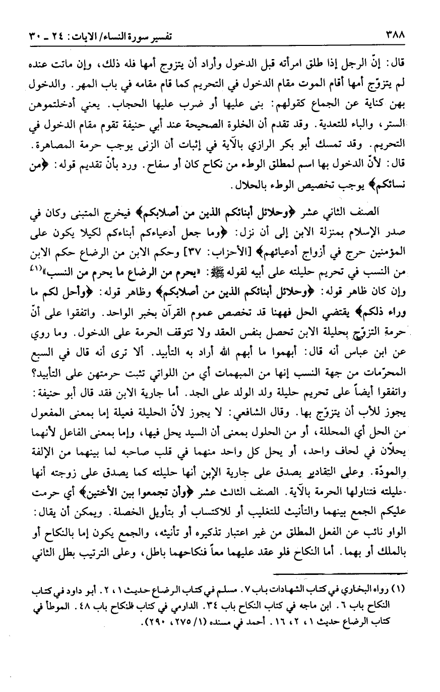 الصنف الثاني عشر وَحَلائِلُ أَبْنائِكُمُ الَّذِينَ مِنْ أَصْلابِكُمْ فيخرج المتبنى وكان في صدر الإسلام بمنزلة الابن إلى أن نزل: وَما جَعَلَ أَدْعِياءَكُمْ أَبْناءَكُمْ لِكَيْ لا يَكُونَ عَلَى الْمُؤْمِنِينَ حَرَجٌ فِي أَزْواجِ أَدْعِيائِهِمْ [الأحزاب: 37] وحكم الابن من الرضاع حكم الابن من النسب في تحريم حليلته على أبيه