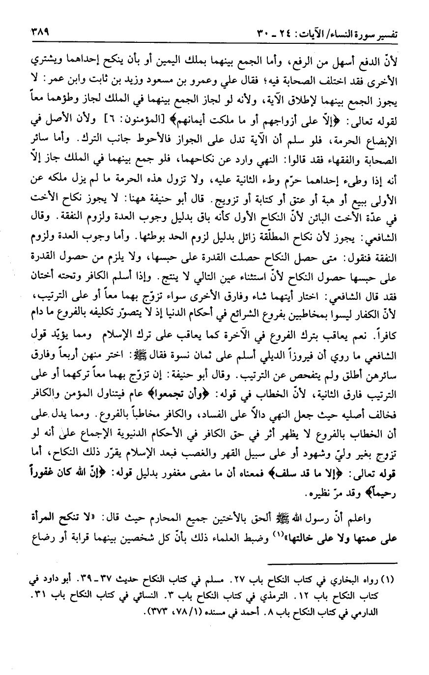 وقال أبو حنيفة: إن تزوّج بهما معا تركهما أو على الترتيب فارق الثانية، لأنّ الخطاب في قوله: وَأَنْ تَجْمَعُوا عام فيتناول المؤمن والكافر فخالف أصليه حيث جعل النهي دالا على الفساد، والكافر مخاطبا بالفروع. ومما يدل على أن الخطاب بالفروع لا يظهر أثر في حق الكافر في الأحكام الدنيوية الإجماع على أنه لو تزوج بغير وليّ وشهود أو على سبيل القهر والغصب فبعد الإسلام يقرّر ذلك النكاح، أما قوله تعالى: إِلَّا ما قَدْ سَلَفَ فمعناه أن ما مضى مغفور بدليل قوله: إِنَّ اللَّهَ كانَ غَفُوراً رَحِيماً وقد مرّ نظيره.